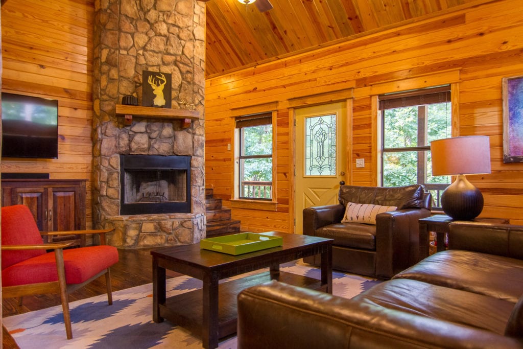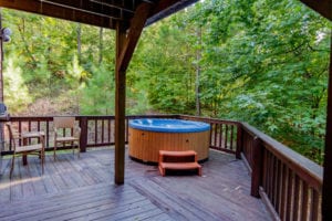 Creek Ridge Cabin sleeps 6 people with two rooms and a loft, but after seeing the deck your group might just choose to sleep under the stars. The wrap-around porch covers three full sides of the cabin, sporting everything from comfy deck chairs to the luxurious 5-person hot tub! And, if you’re looking for even more privacy? There’s a private deck off the upstairs bedroom.