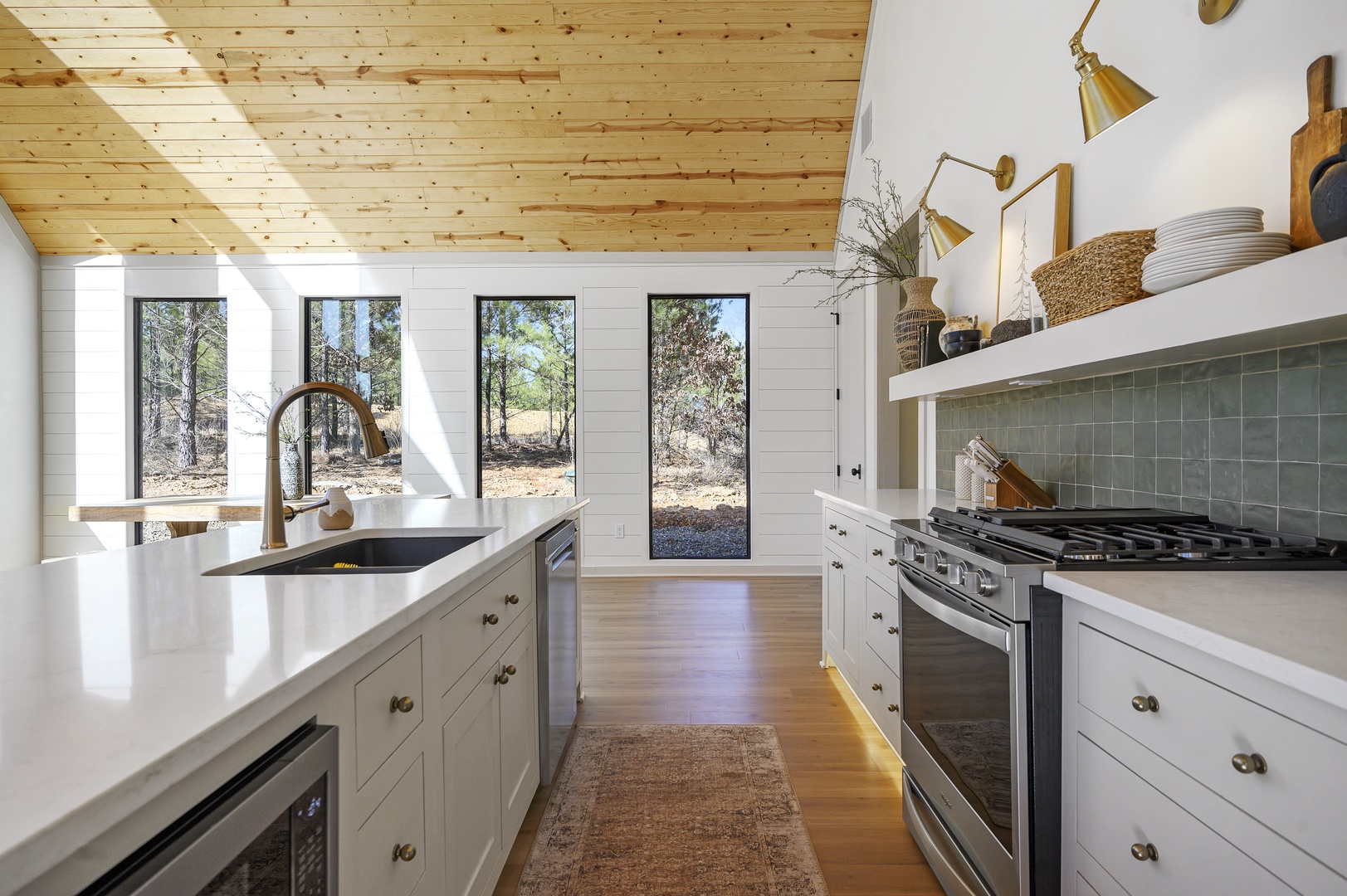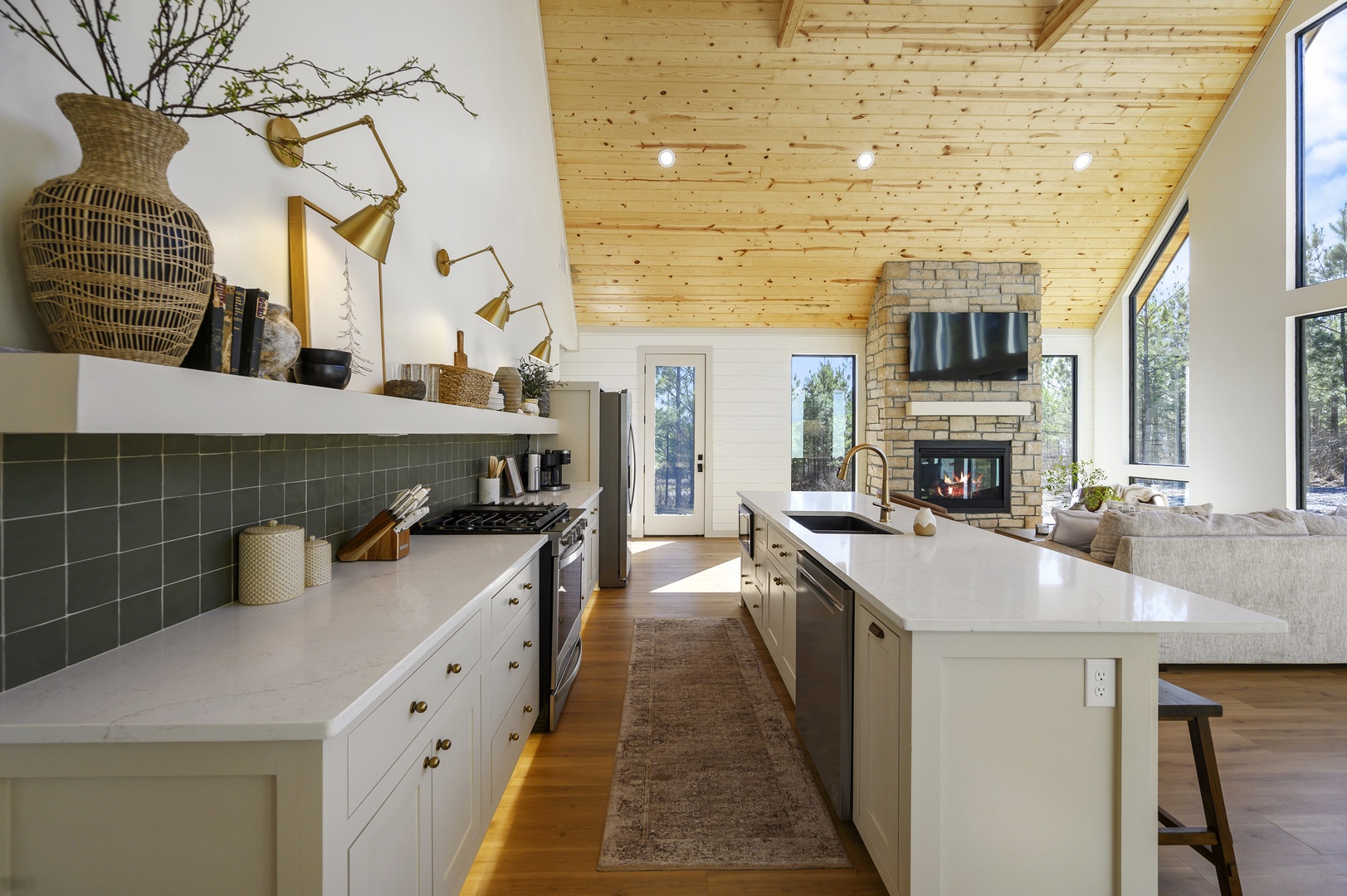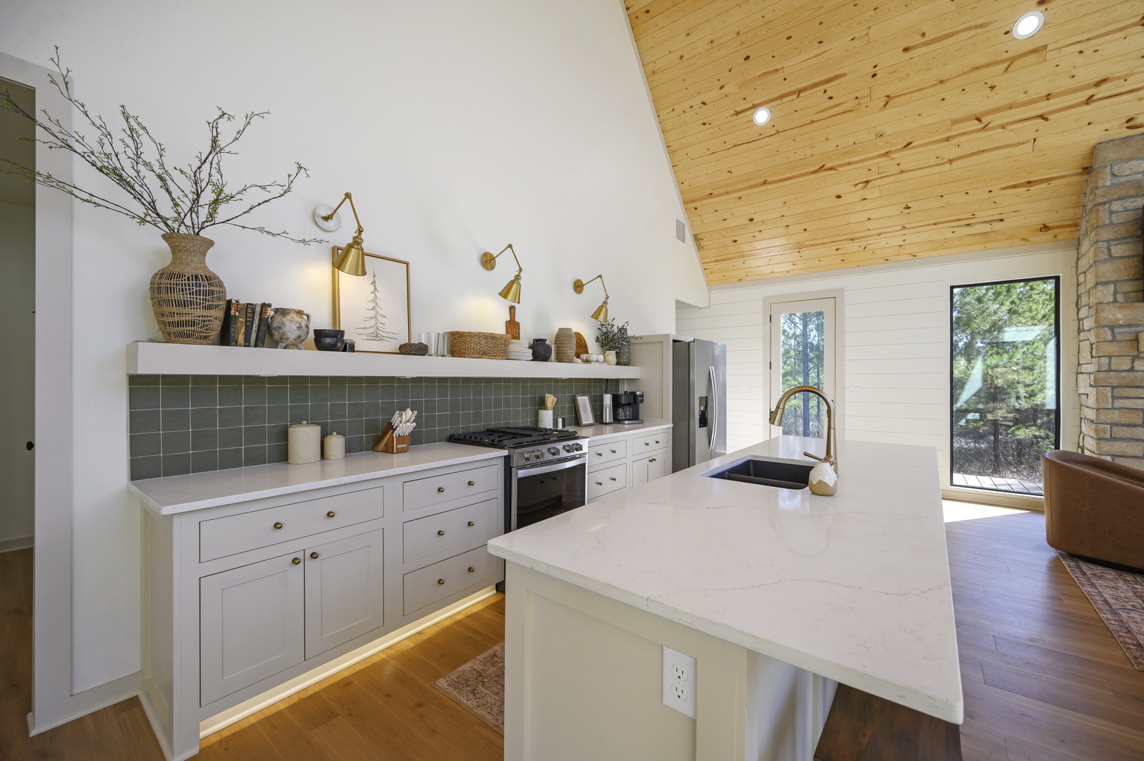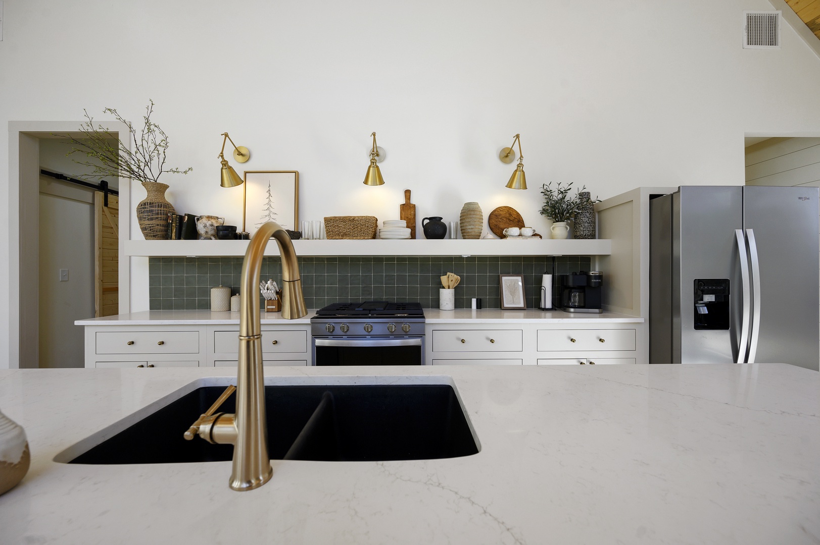 KITCHEN: The chef’s kitchen is fully stocked with all the pots/pans and appliances you’ll need (and likely more!) to prepare meals. It features custom cabinetry, quartz countertops, gas cooktop, sink and high end oven, dishwasher and refrigerator. Also included is both a Keurig coffee maker and one-cup pod machine; starter coffee will be provided.