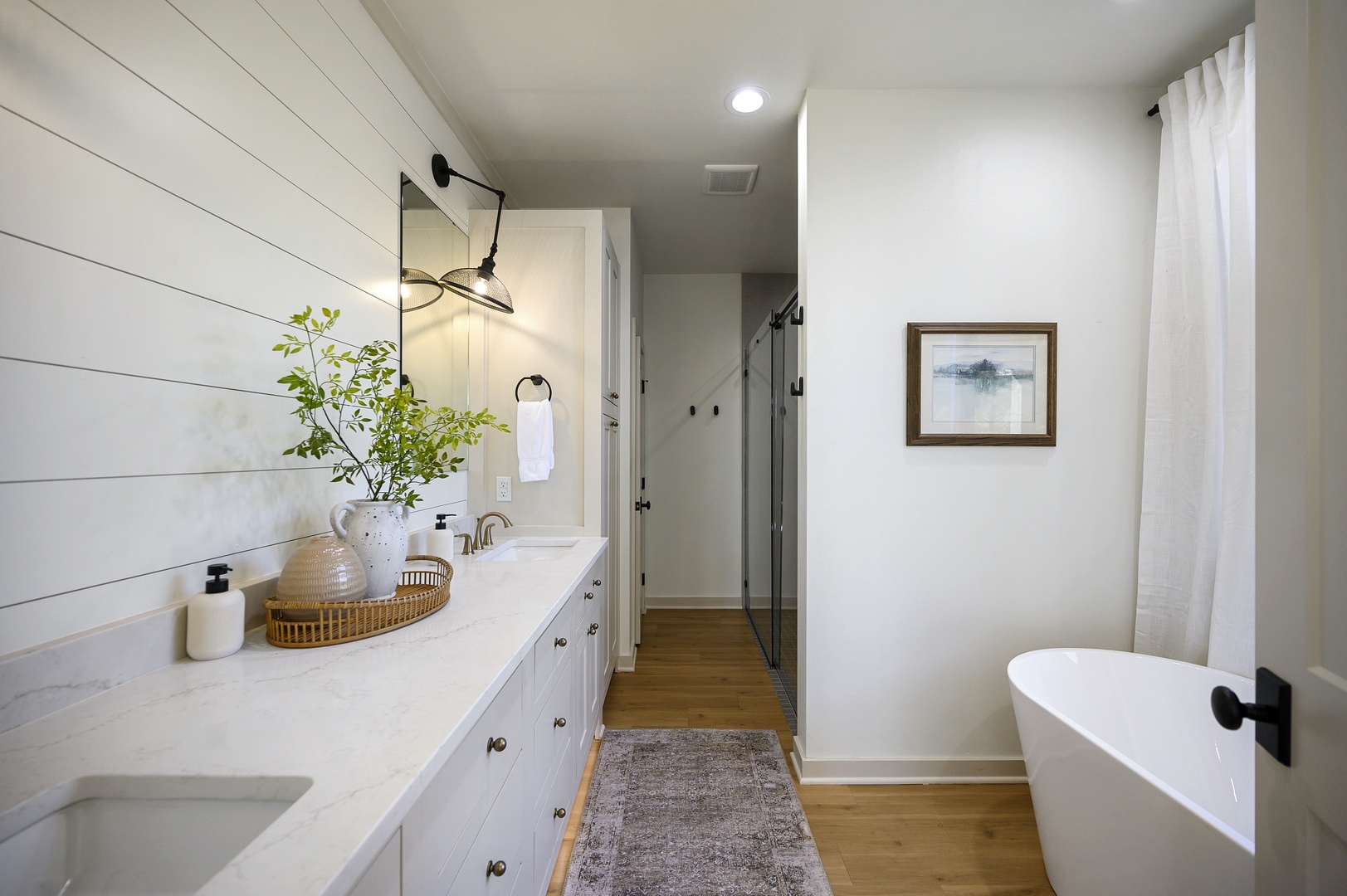 The downstairs master is absolutely gorgeous and was designed with comfort in mind. The king sized bed features a luxury mattress and linens so you’re sure to enjoy an incredible night's sleep. The ensuite bathroom features two sinks, a soaker tub, huge walk-in shower with dual shower heads and toilet room. All towels and soap are provided.