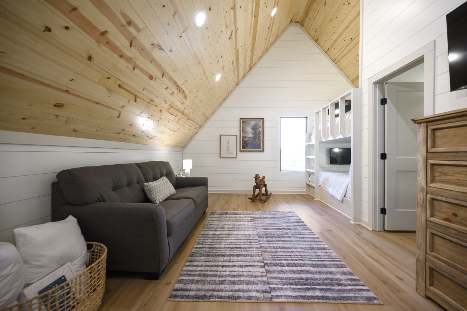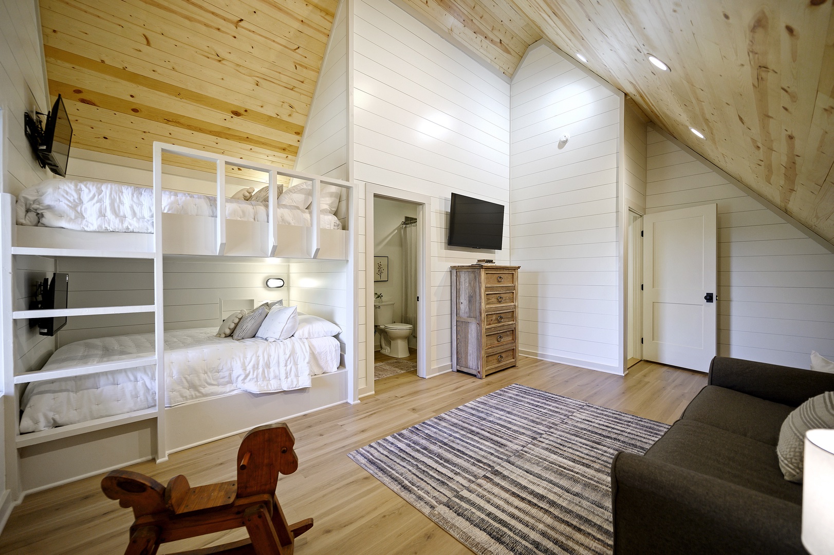 Upstairs, you’ll find a spacious private space with Queen bunks, pull out couch and a private full bathroom. Your guests will love the entertainment options to include an arcade game featuring hundreds of classic games and TV’s located at-each-bed… suitable for the most personalized entertainment viewing experience!