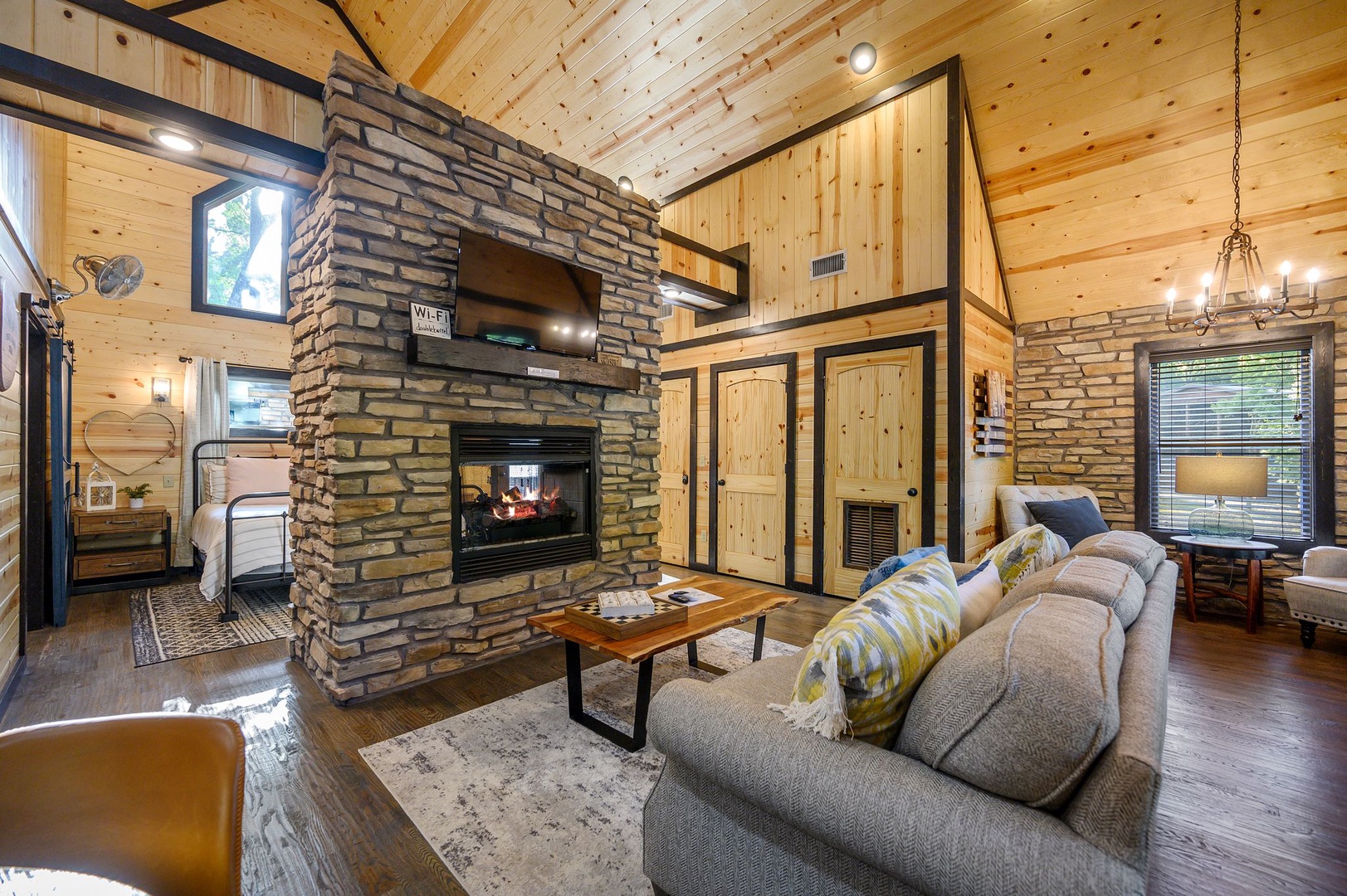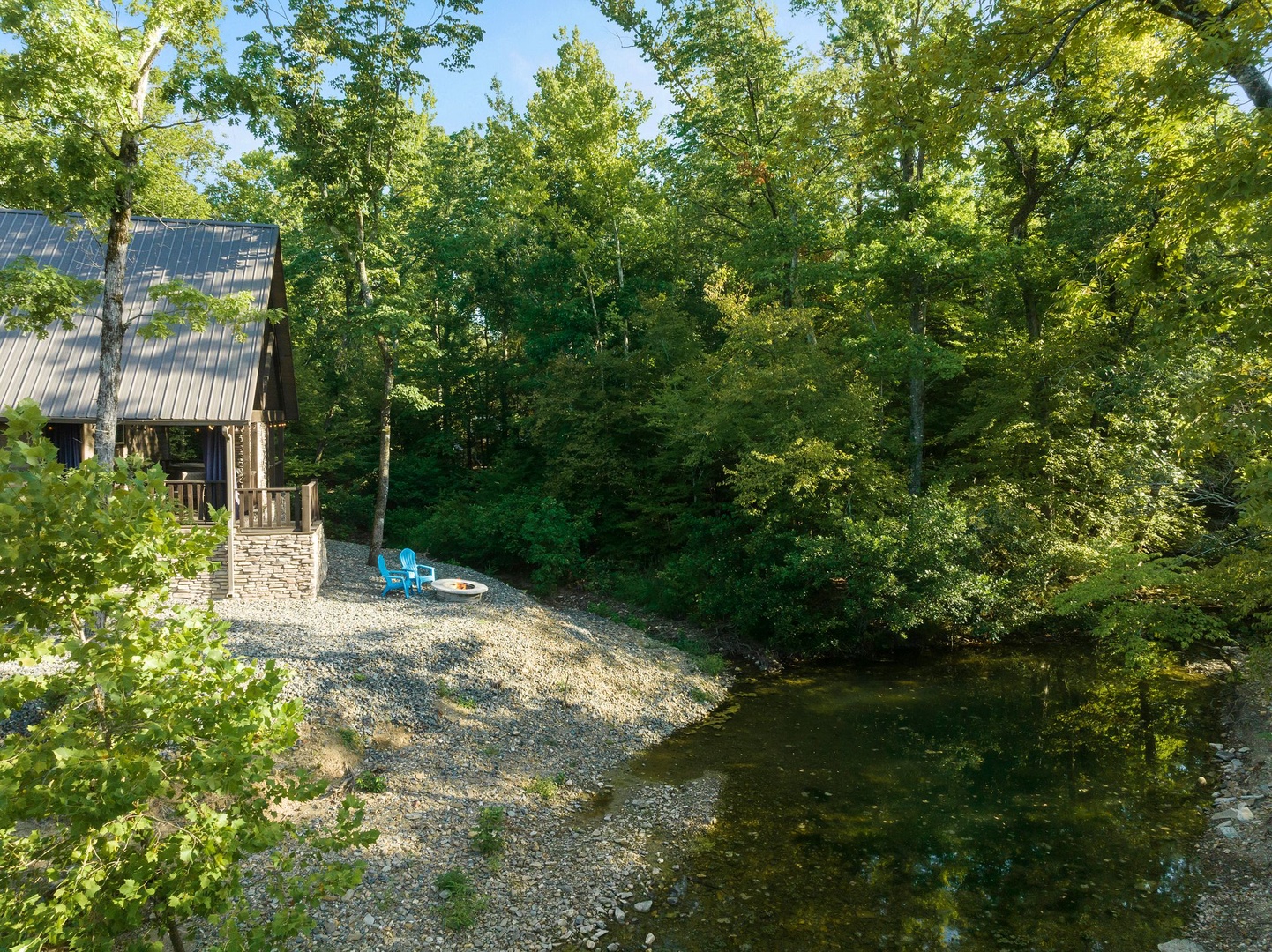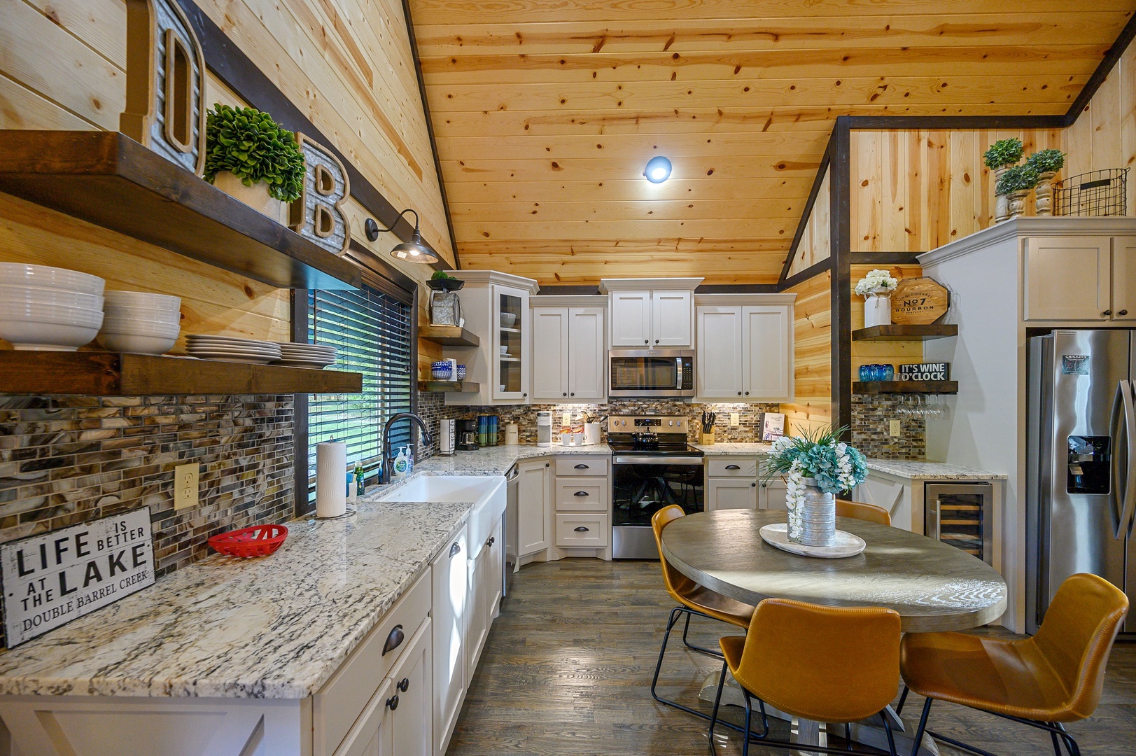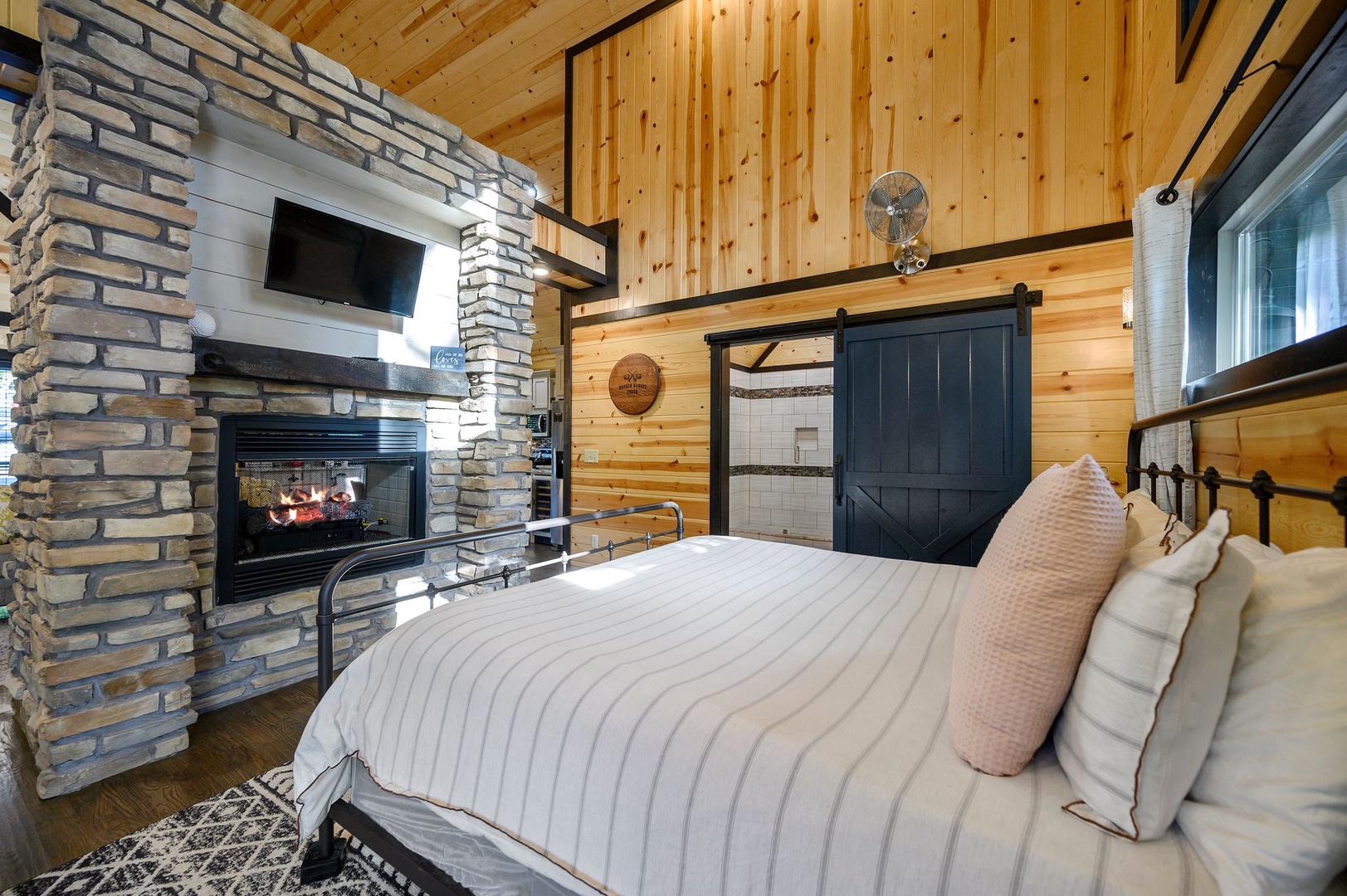 Close walking distance to local attractions, Mountain Fork Brewery, Hochatown Distilling Co, Escape Games, and restaurants. Double Barrel Creek is the ultimate couples cabin. Situated on the banks of a creek with tall pine trees. Turn-key studio style design with a double sided stone fireplace to enjoy from the main living room area or the bedroom. There is ample space in the beautifully designed eat-in kitchen for all of your cooking needs. Granite countertops, stainless steel appliances, open shelving and custom cabinets, farmhouse sink, and wine fridge. There is a separate sitting area perfect for a reading nook. The bathroom was designed with relaxation in mind and features a stone fireplace. Light the fire and take in the ambiance while soaking in the claw foot tub. Large walk-in tiled shower to enjoy as well. Take in the views of the creek from the back porch while relaxing in the hot tub.