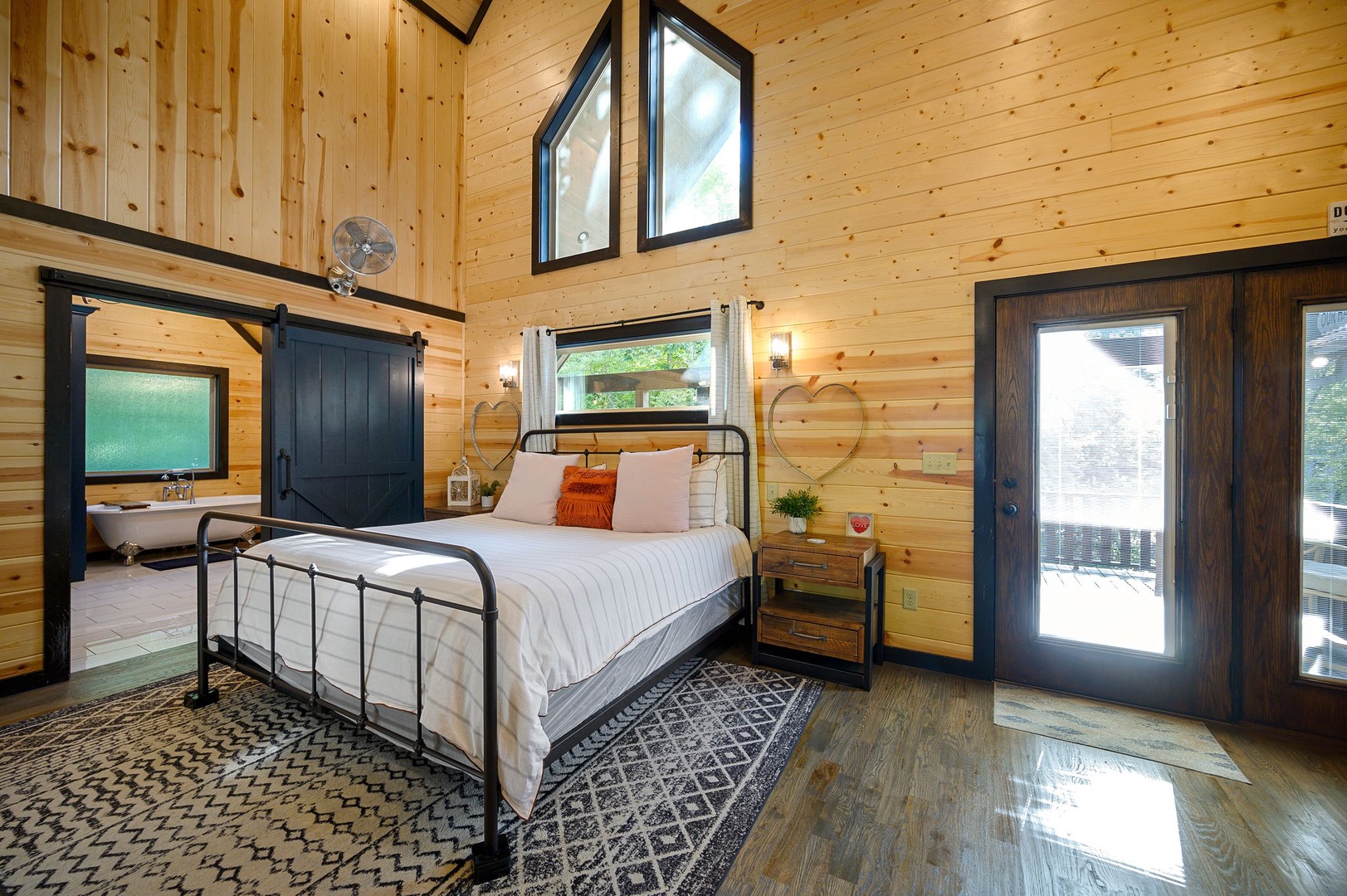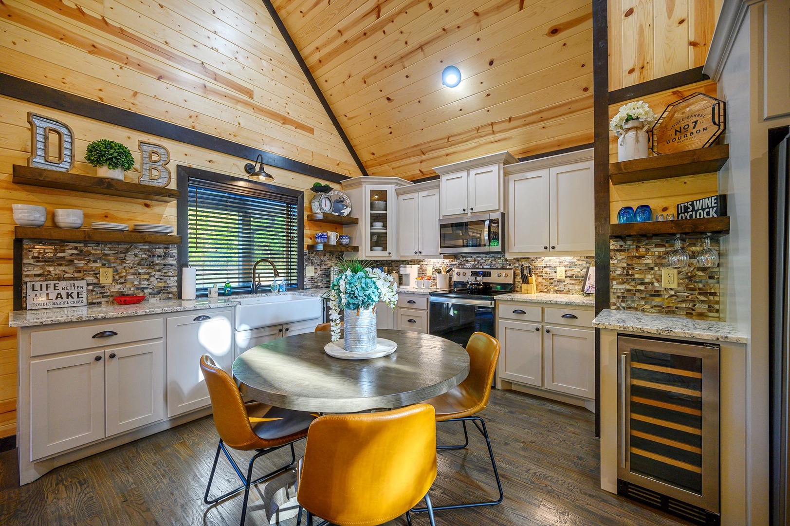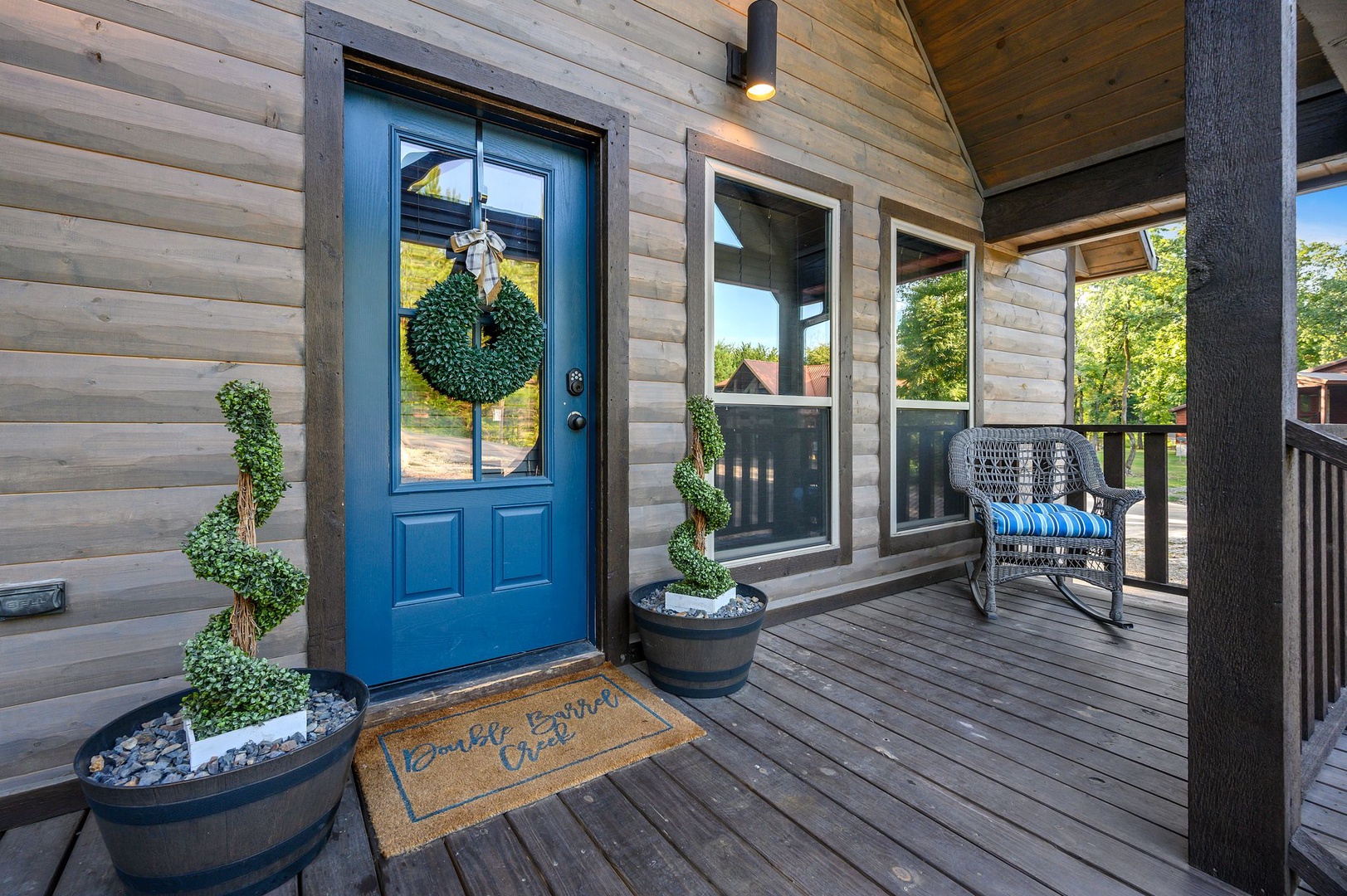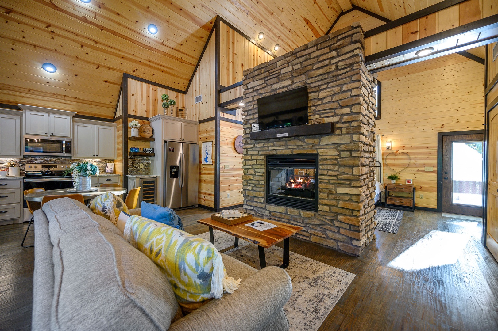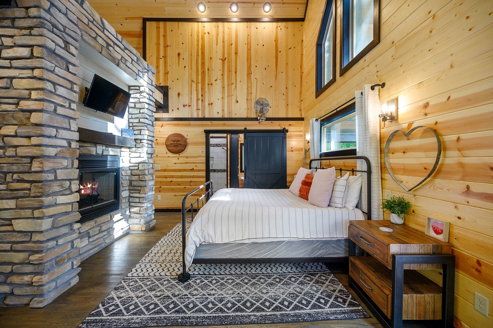 Close walking distance to local attractions, Mountain Fork Brewery, Hochatown Distilling Co, Escape Games, and restaurants. Double Barrel Creek is the ultimate couples cabin. Situated on the banks of a creek with tall pine trees. Turn-key studio style design with a double sided stone fireplace to enjoy from the main living room area or the bedroom. There is ample space in the beautifully designed eat-in kitchen for all of your cooking needs. Granite countertops, stainless steel appliances, open shelving and custom cabinets, farmhouse sink, and wine fridge. There is a separate sitting area perfect for a reading nook. The bathroom was designed with relaxation in mind and features a stone fireplace. Light the fire and take in the ambiance while soaking in the claw foot tub. Large walk-in tiled shower to enjoy as well. Take in the views of the creek from the back porch while relaxing in the hot tub.