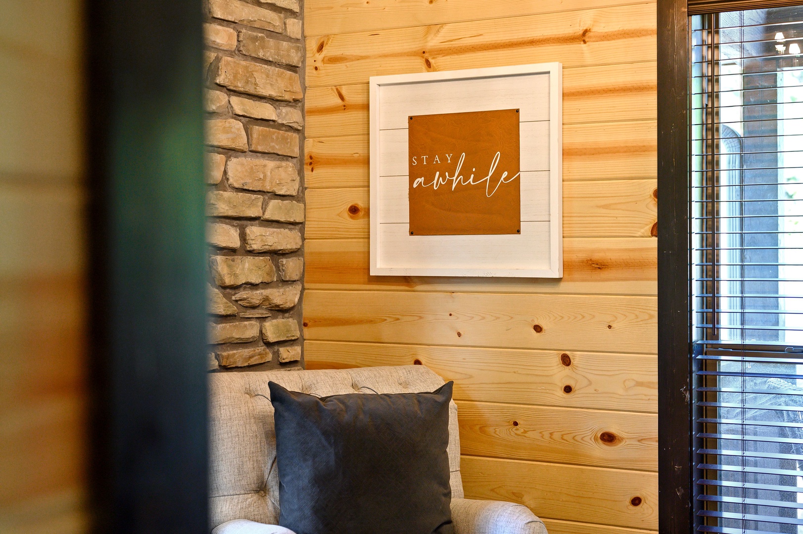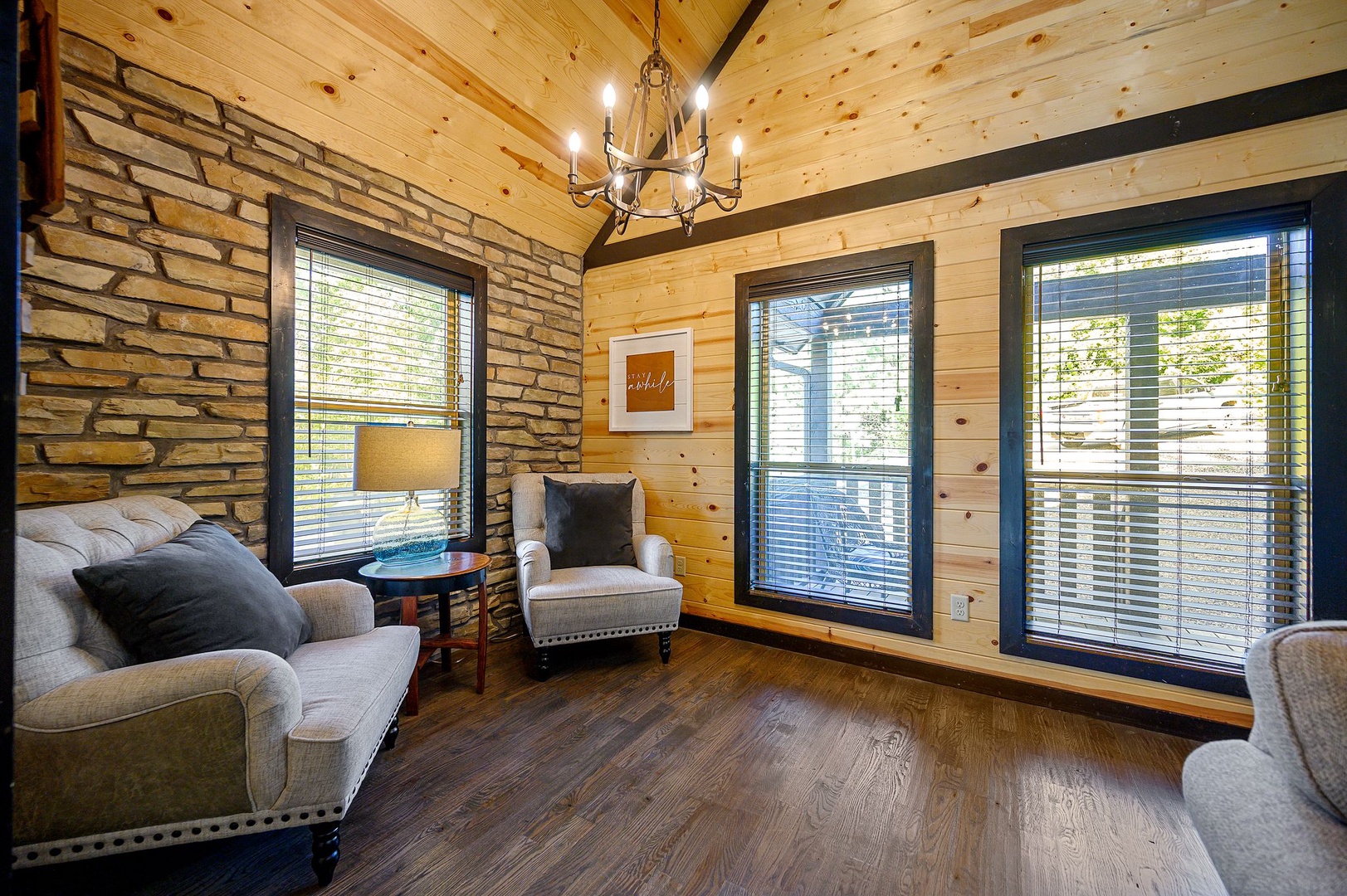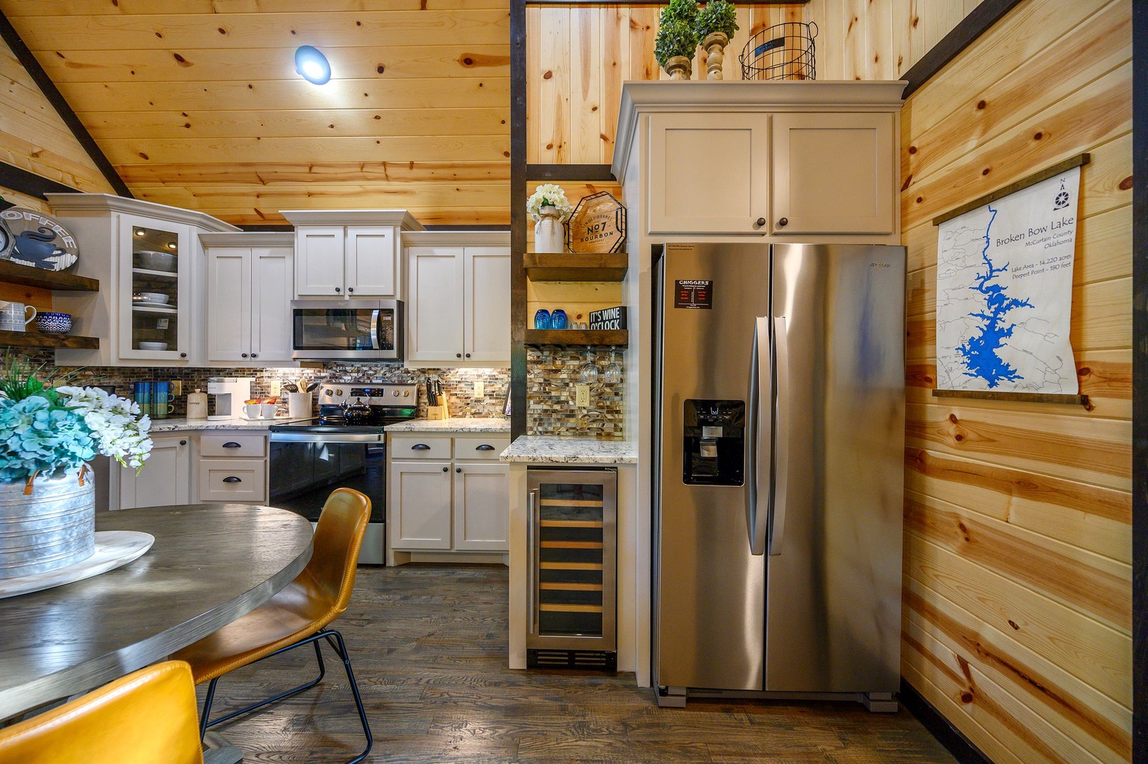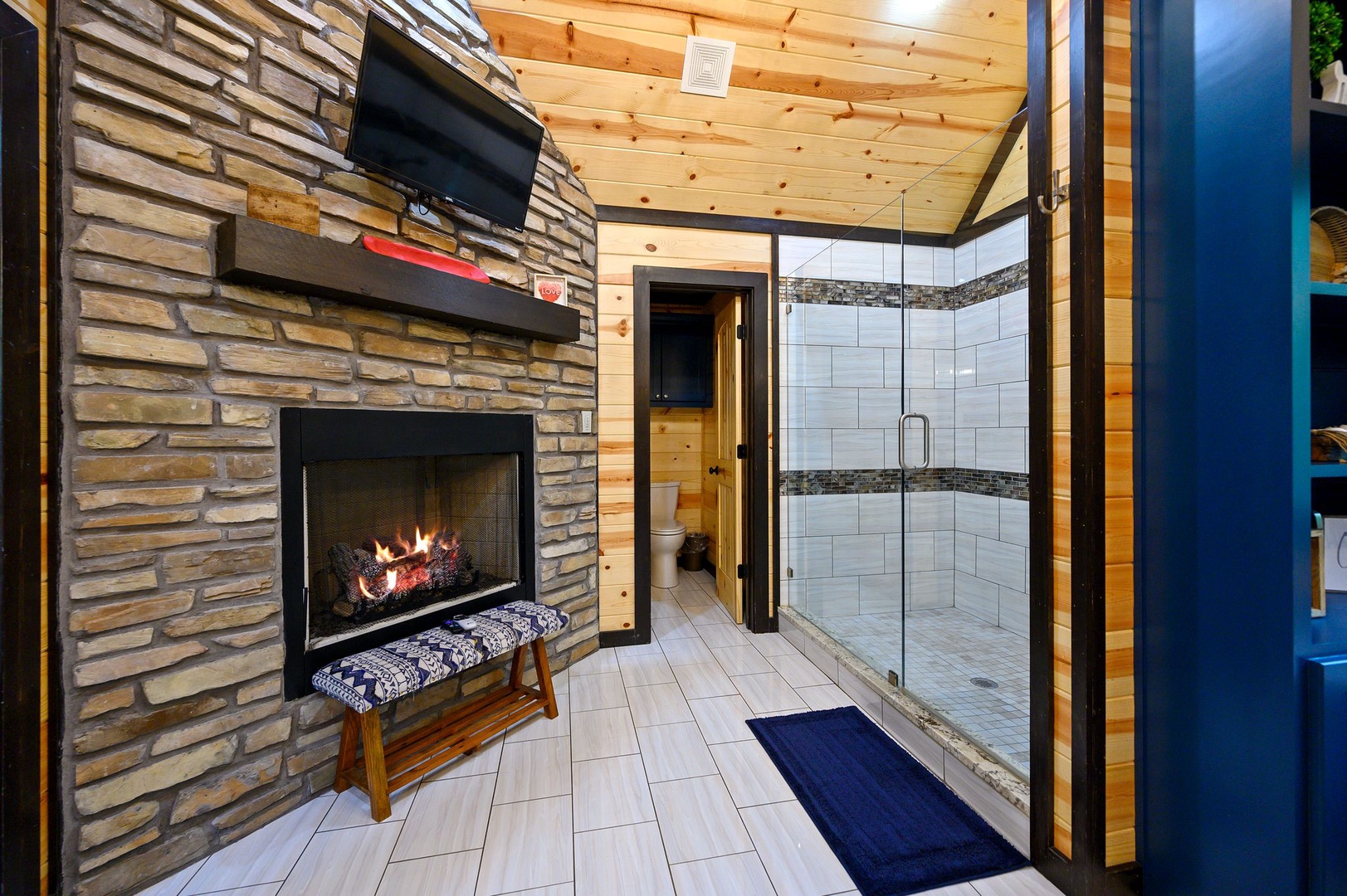 Close walking distance to local attractions, Mountain Fork Brewery, Hochatown Distilling Co, Escape Games, and restaurants. Double Barrel Creek is the ultimate couples cabin. Situated on the banks of a creek with tall pine trees. Turn-key studio style design with a double sided stone fireplace to enjoy from the main living room area or the bedroom. There is ample space in the beautifully designed eat-in kitchen for all of your cooking needs. Granite countertops, stainless steel appliances, open shelving and custom cabinets, farmhouse sink, and wine fridge. There is a separate sitting area perfect for a reading nook. The bathroom was designed with relaxation in mind and features a stone fireplace. Light the fire and take in the ambiance while soaking in the claw foot tub. Large walk-in tiled shower to enjoy as well. Take in the views of the creek from the back porch while relaxing in the hot tub.