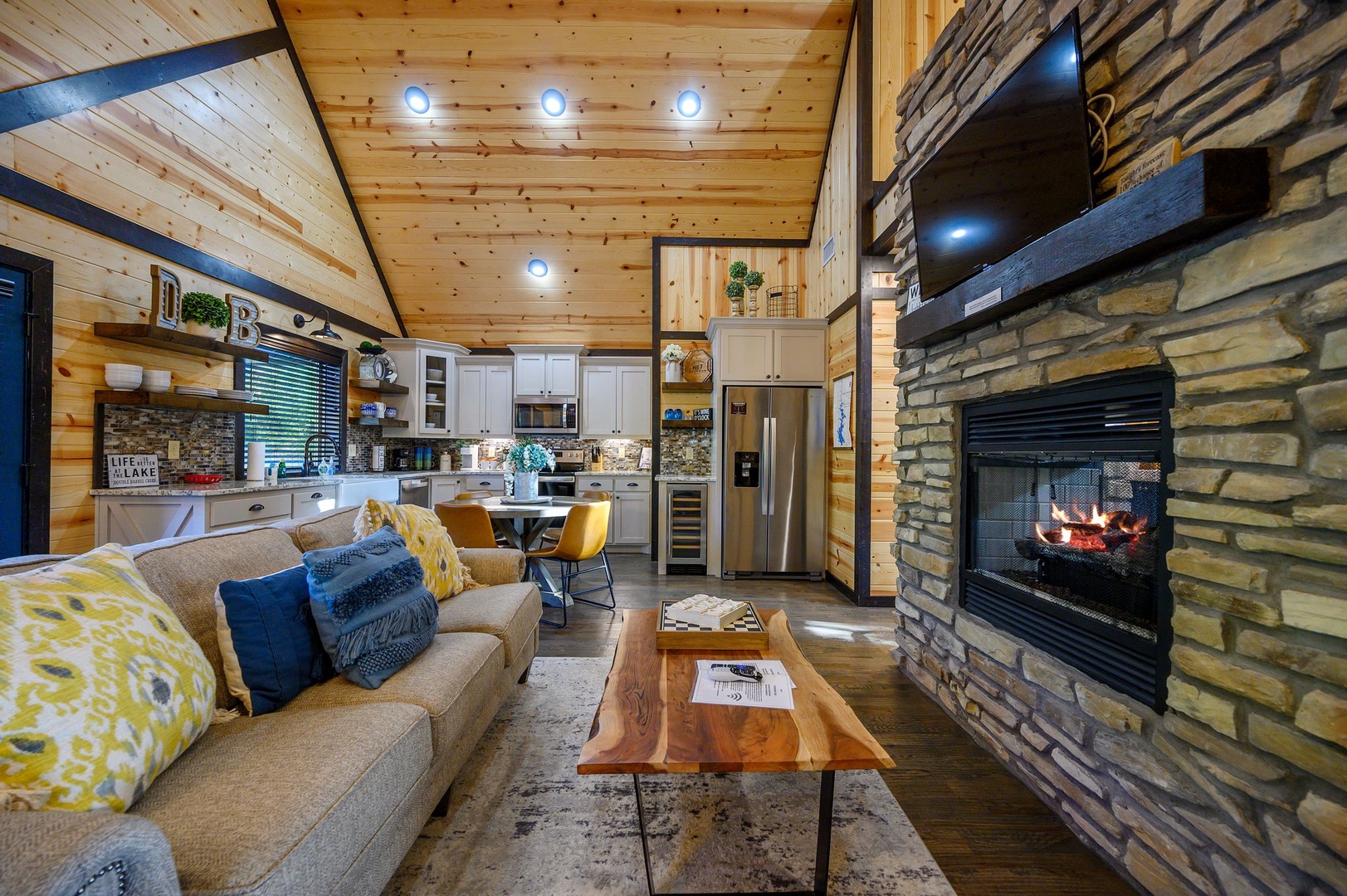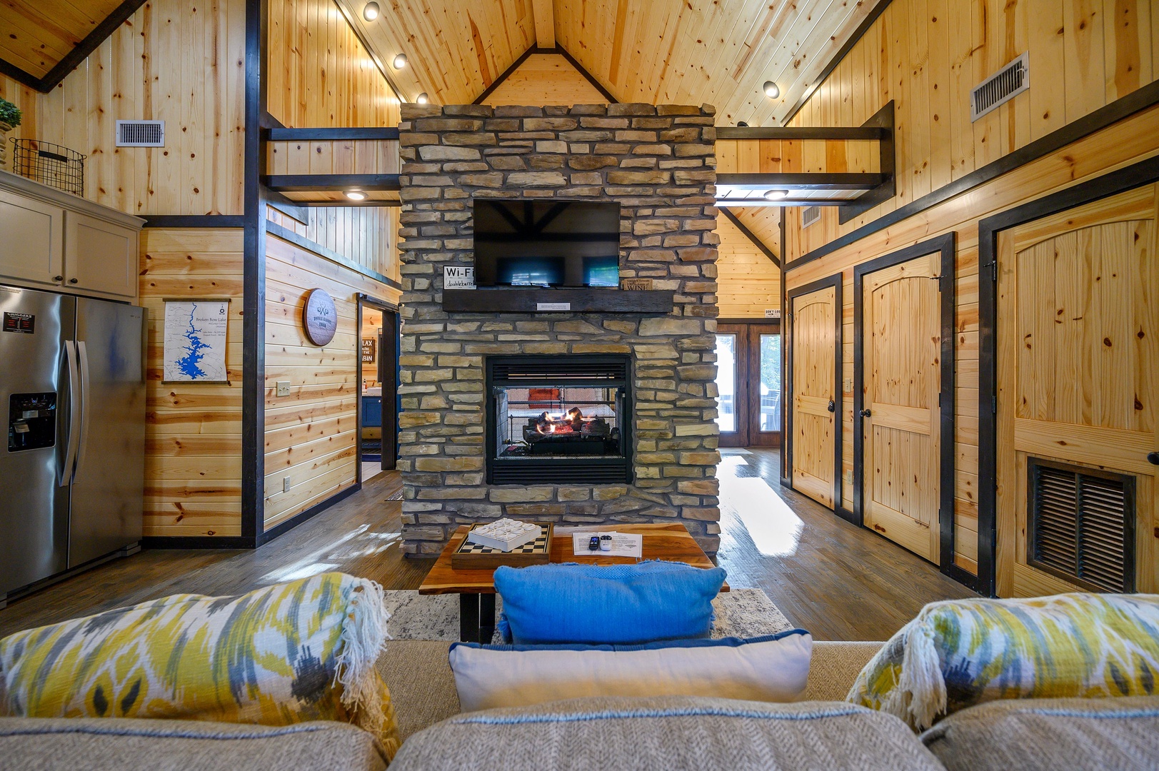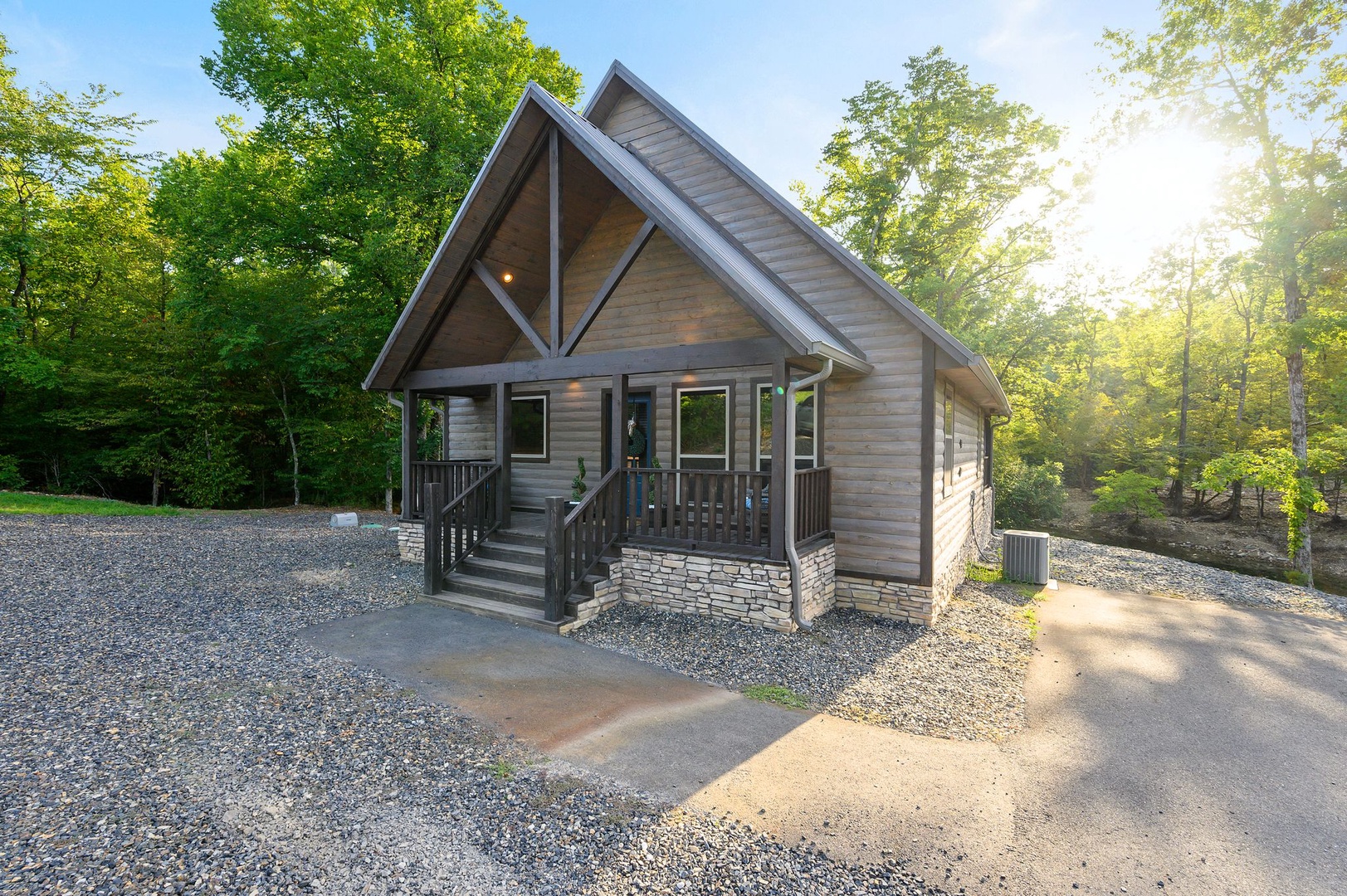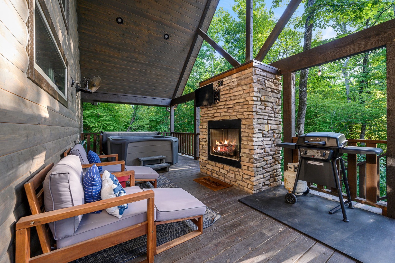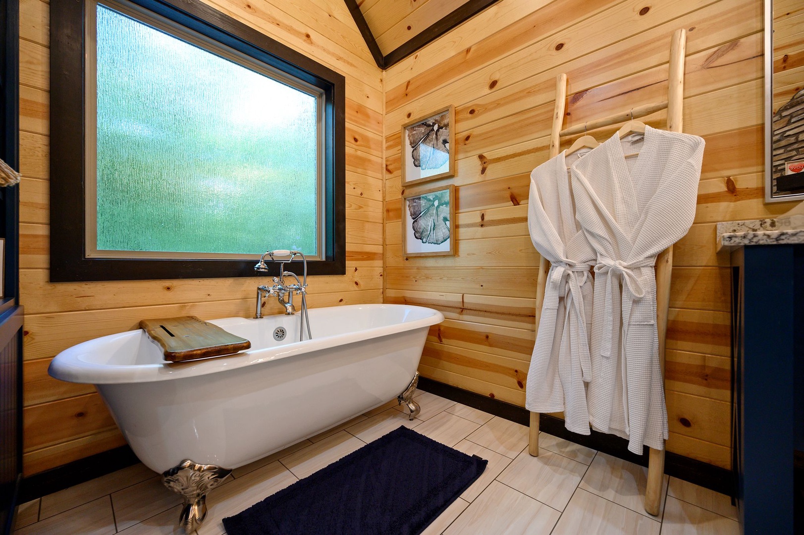 Close walking distance to local attractions, Mountain Fork Brewery, Hochatown Distilling Co, Escape Games, and restaurants. Double Barrel Creek is the ultimate couples cabin. Situated on the banks of a creek with tall pine trees. Turn-key studio style design with a double sided stone fireplace to enjoy from the main living room area or the bedroom. There is ample space in the beautifully designed eat-in kitchen for all of your cooking needs. Granite countertops, stainless steel appliances, open shelving and custom cabinets, farmhouse sink, and wine fridge. There is a separate sitting area perfect for a reading nook. The bathroom was designed with relaxation in mind and features a stone fireplace. Light the fire and take in the ambiance while soaking in the claw foot tub. Large walk-in tiled shower to enjoy as well. Take in the views of the creek from the back porch while relaxing in the hot tub.