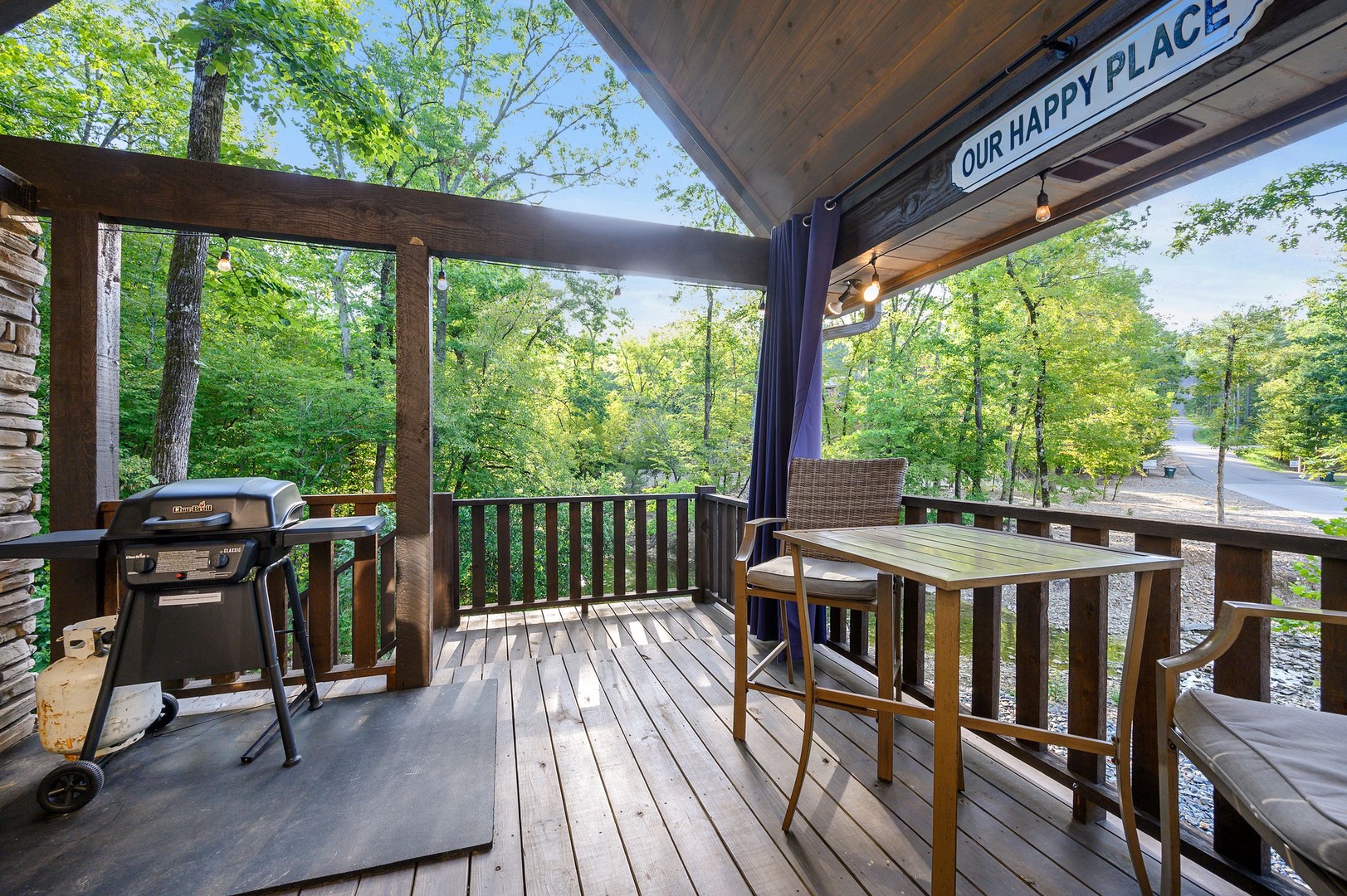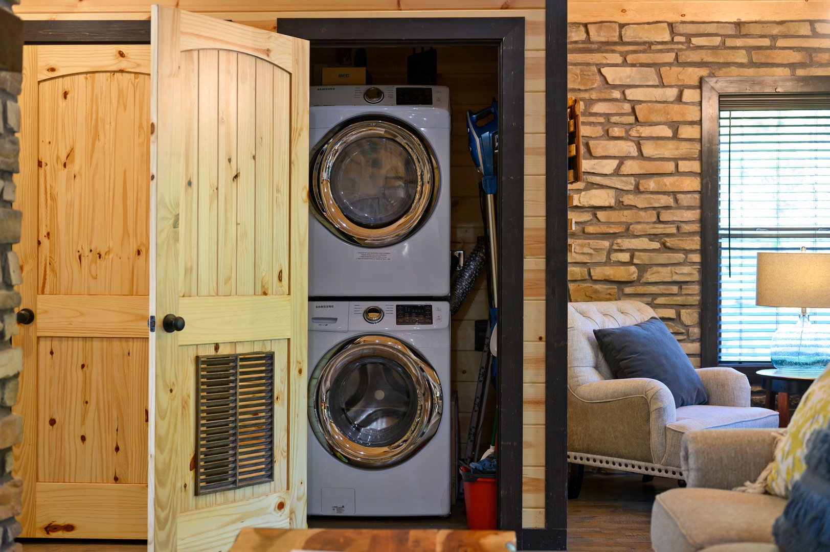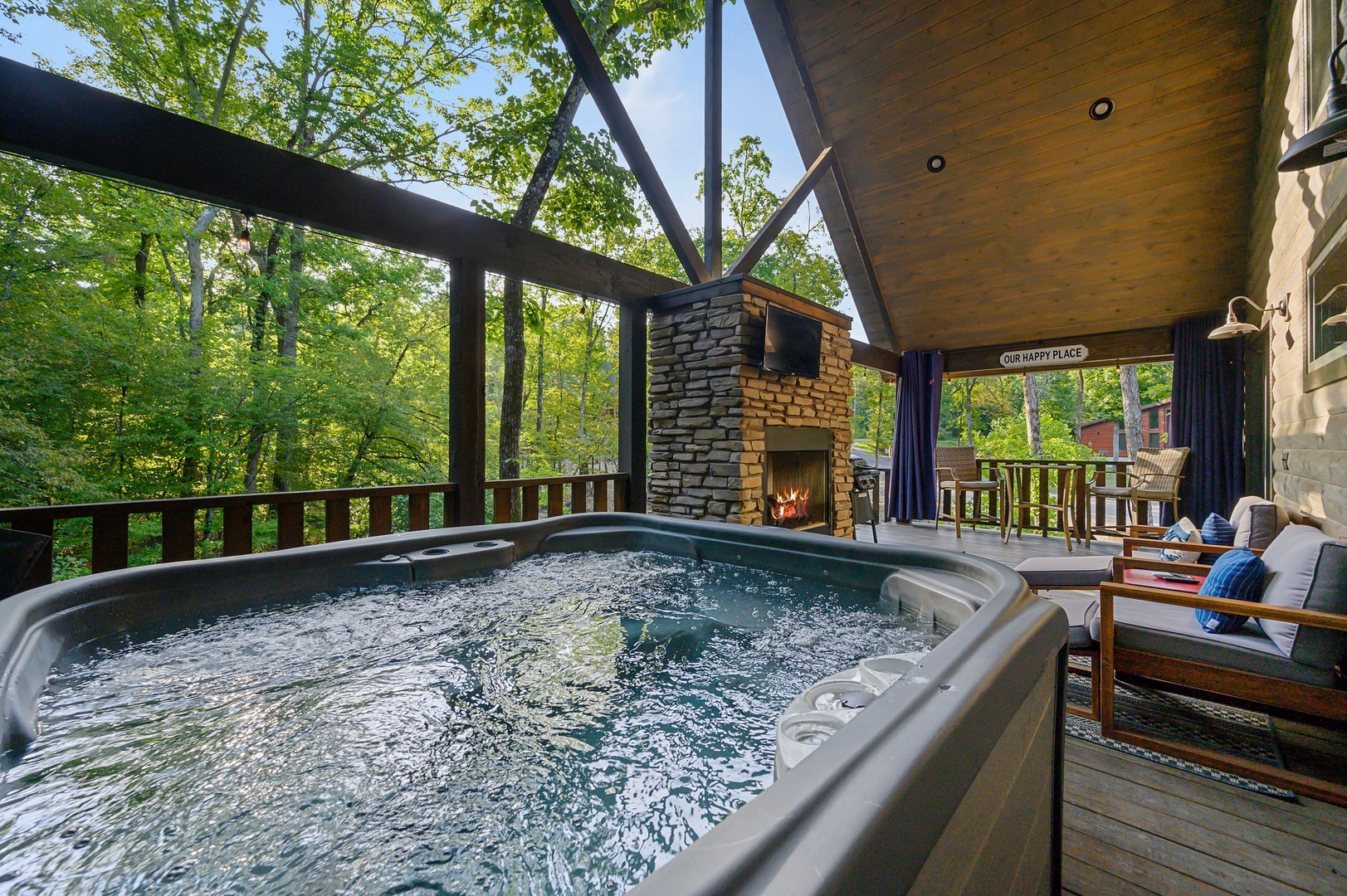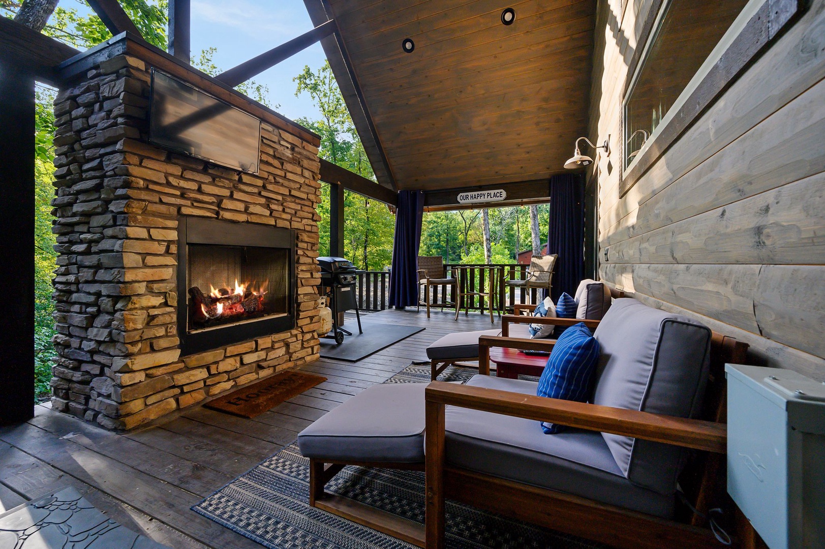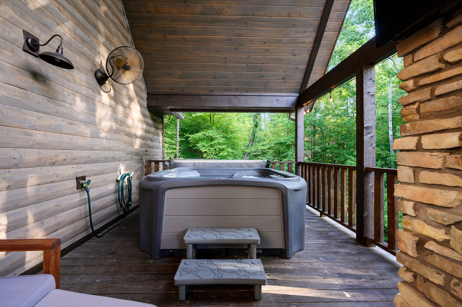Close walking distance to local attractions, Mountain Fork Brewery, Hochatown Distilling Co, Escape Games, and restaurants. Double Barrel Creek is the ultimate couples cabin. Situated on the banks of a creek with tall pine trees. Turn-key studio style design with a double sided stone fireplace to enjoy from the main living room area or the bedroom. There is ample space in the beautifully designed eat-in kitchen for all of your cooking needs. Granite countertops, stainless steel appliances, open shelving and custom cabinets, farmhouse sink, and wine fridge. There is a separate sitting area perfect for a reading nook. The bathroom was designed with relaxation in mind and features a stone fireplace. Light the fire and take in the ambiance while soaking in the claw foot tub. Large walk-in tiled shower to enjoy as well. Take in the views of the creek from the back porch while relaxing in the hot tub.