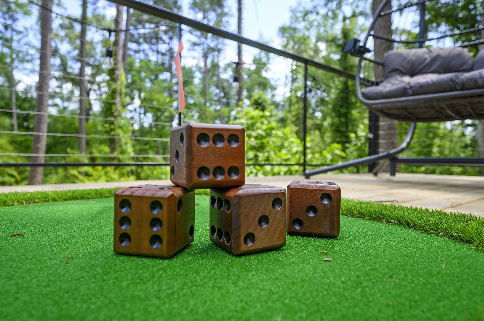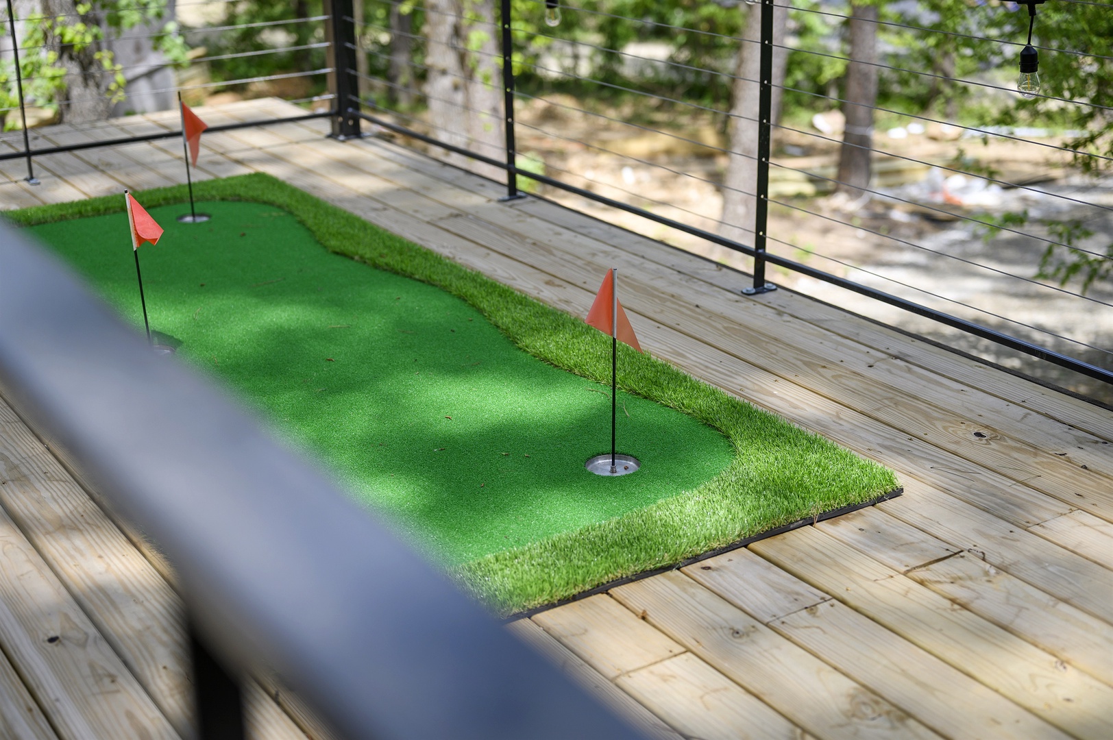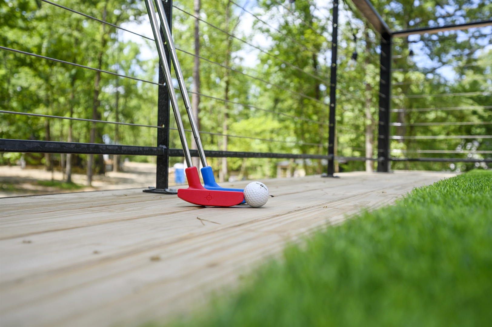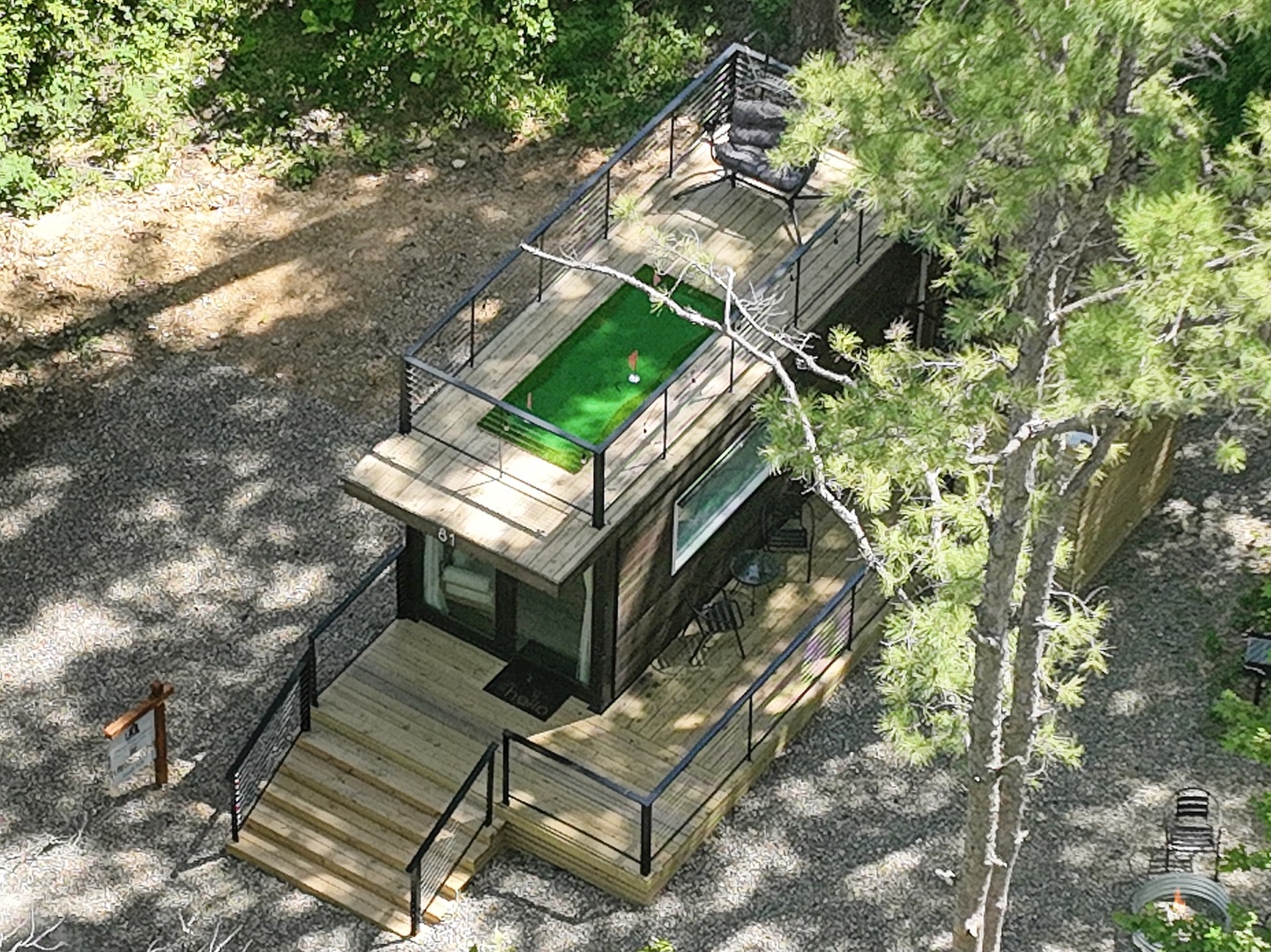 Your first glimpse of this stunning tiny home is the spacious deck that surrounds the home and features a secluded soaking tub and modern fire pit. Access our rooftop deck by a spiral outdoor staircase. The top deck lights up beautifully at night and features a double egg chair and putting green. It's a great place to stargaze or enjoy your morning coffee.