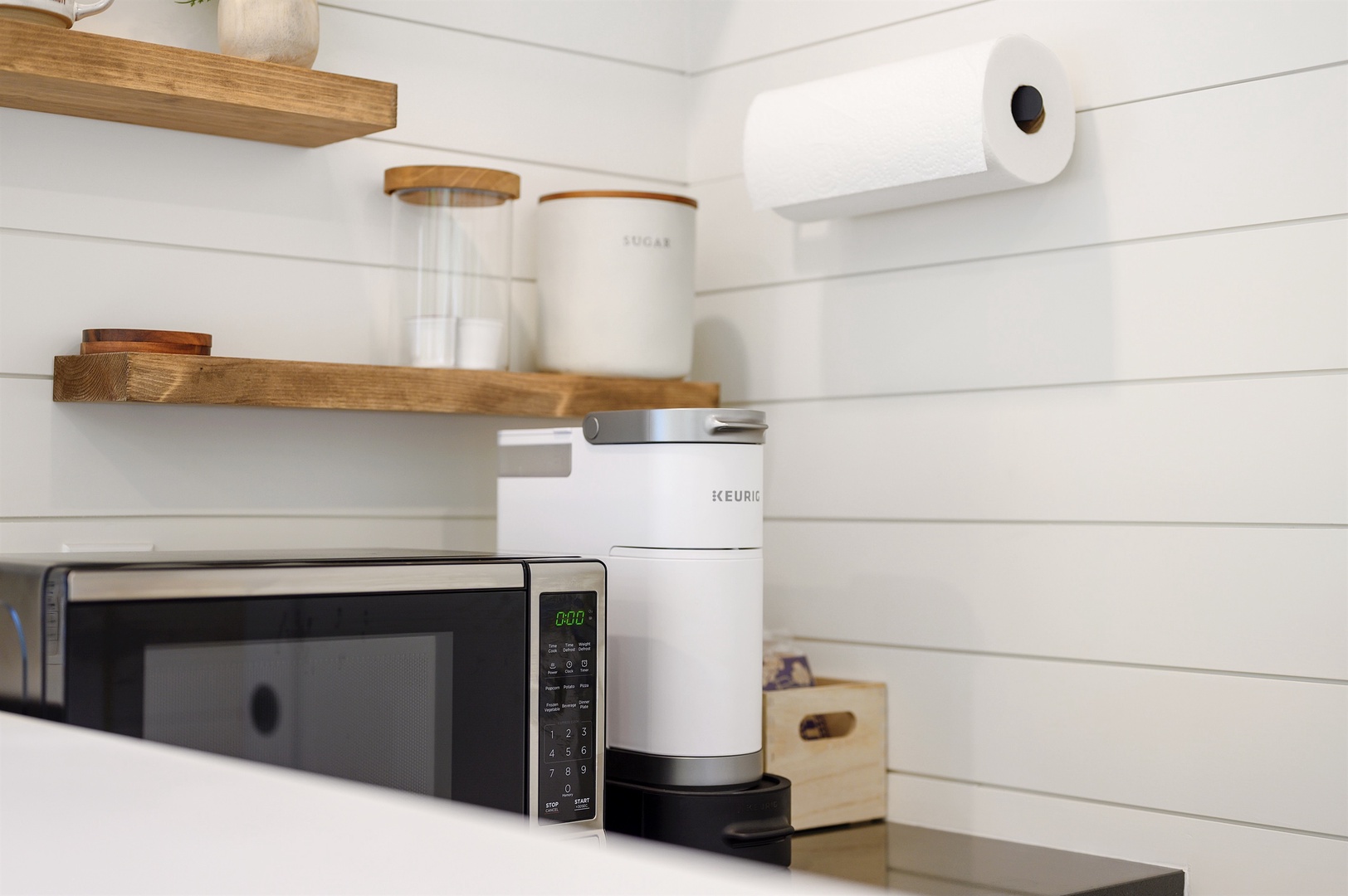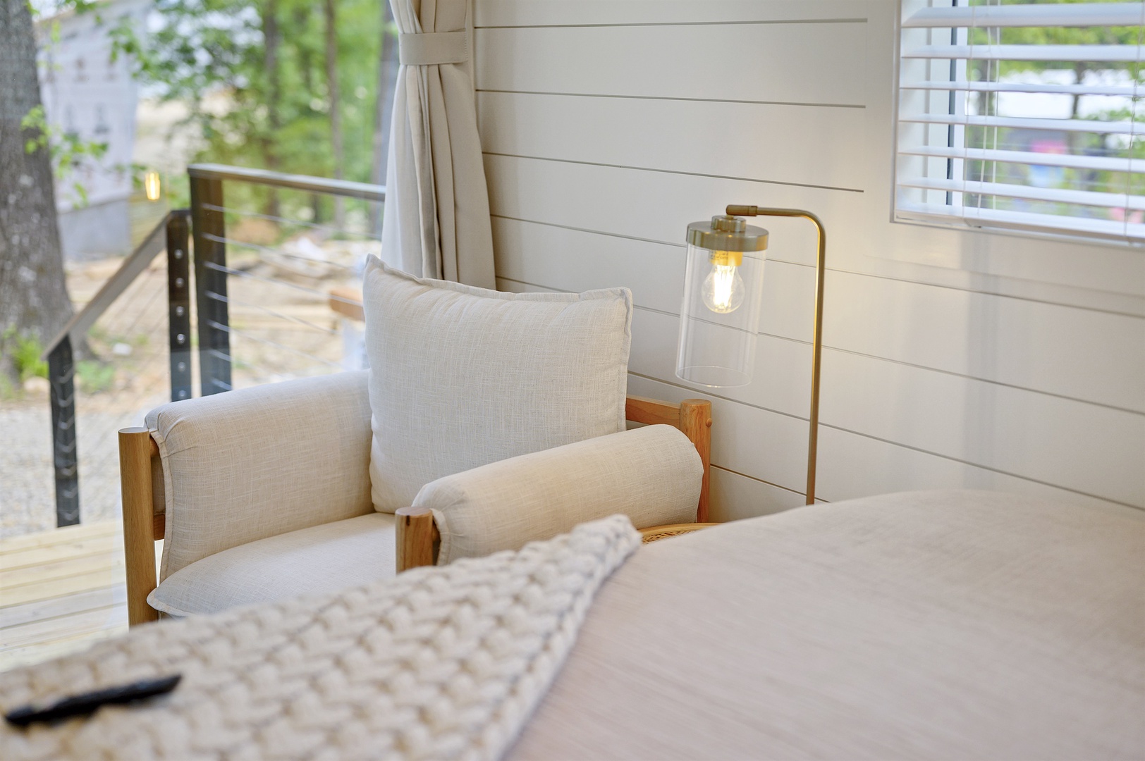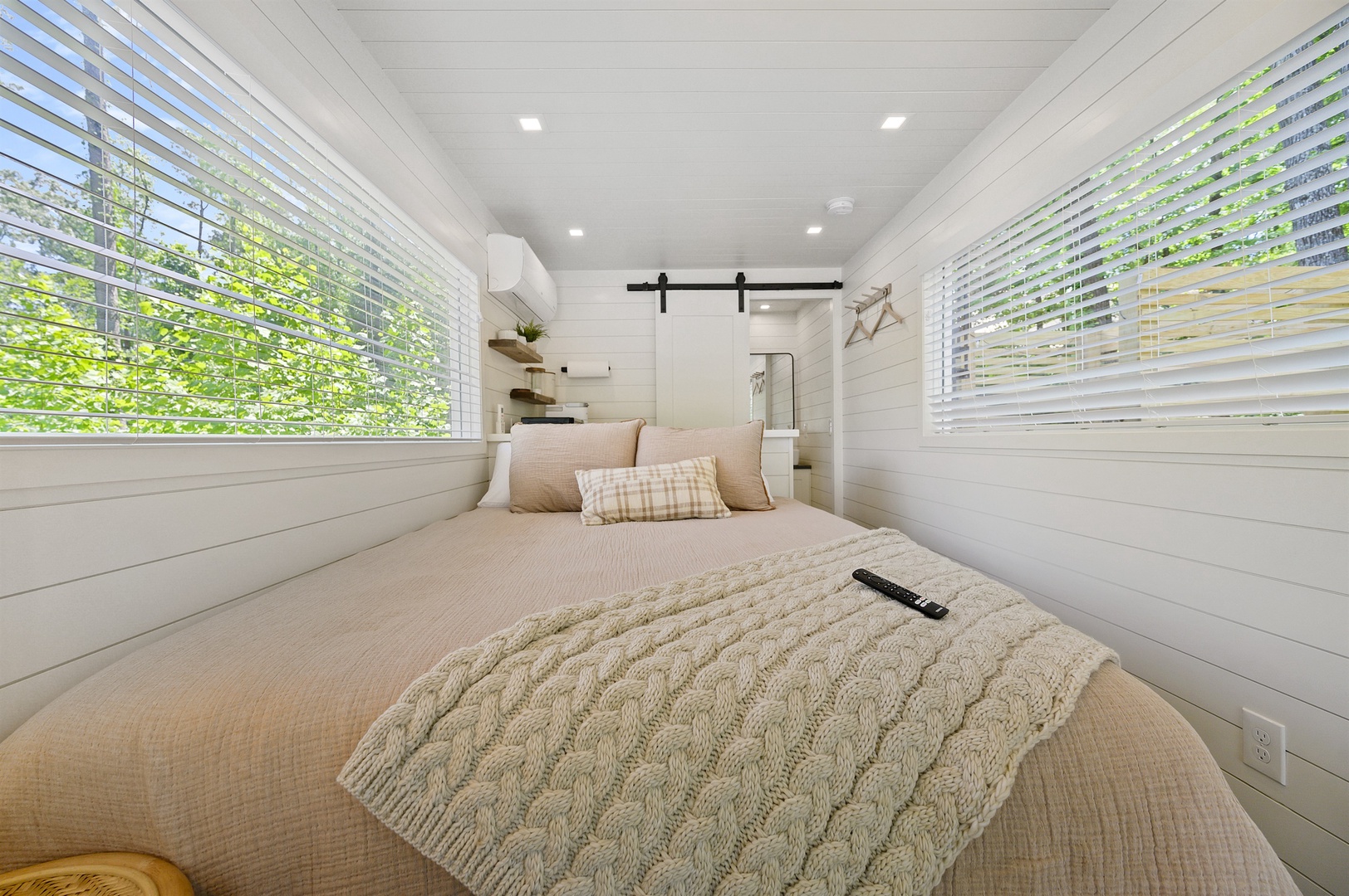 The luxurious queen size bed is outfitted in farmhouse chic and nested beneath a mounted smart TV. Perfect for cloudy day snuggles and movie watching. It overlooks the dramatic double glass door entryway that is outfitted with black out curtains that allow you to sleep as late as you want. The end of the bed has a cozy nook with a chair for reading and side table to hold your coffee. If you'd rather enjoy your coffee outdoors head up the spiral staircase to the rooftop deck and lounge in our double egg chair. If you're feeling more energetic, try out our putting green for a little morning fun!