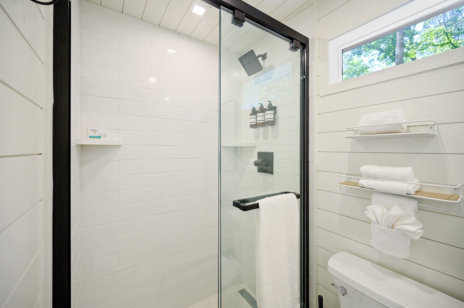 Enter our gorgeous black shiplap bathroom through a sliding barn door outfitted with dramatic gold hardware. The full size walk in custom tiled shower features a rainfall shower head.