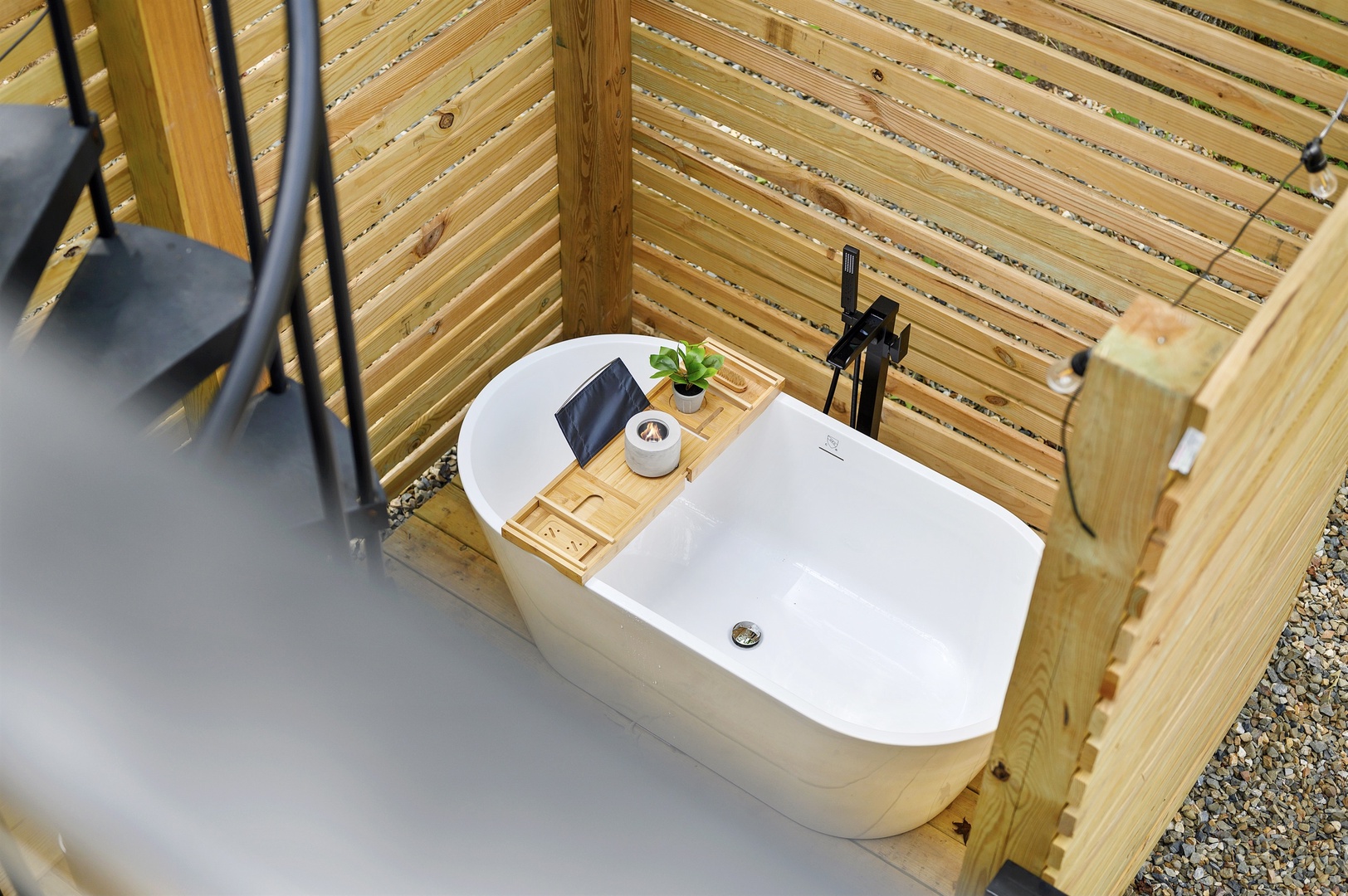 At the end of the day, if your idea of winding down is a leisurely bath under the stars, you will enjoy our outdoor soaker tub located on the lower deck and surrounded on three sides by wood slat walls and fairy lights. It also features a wooden tray to hold your glass of wine.