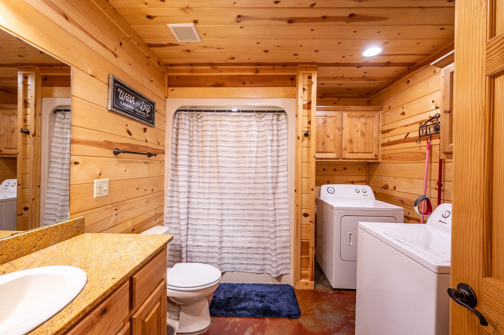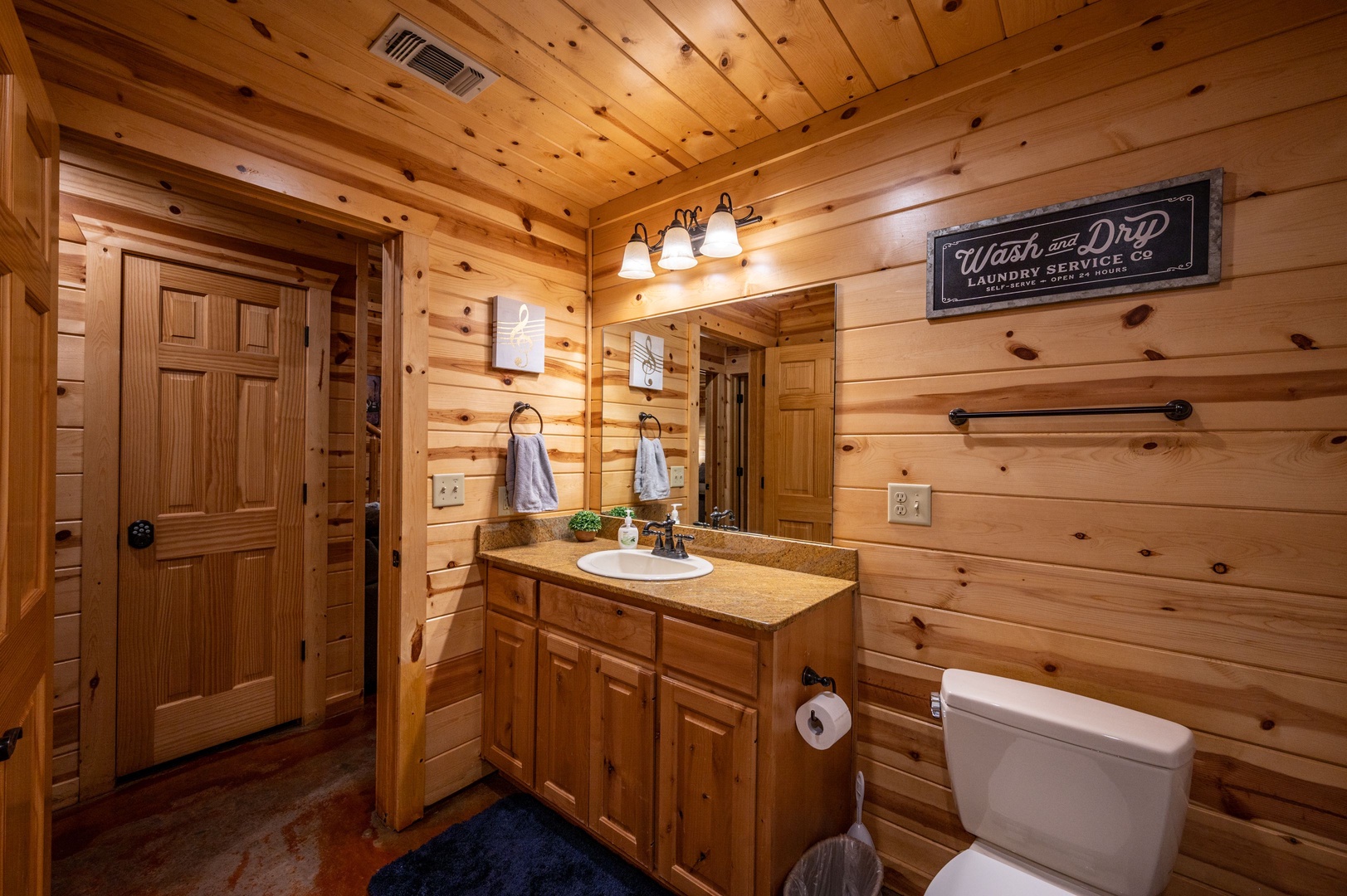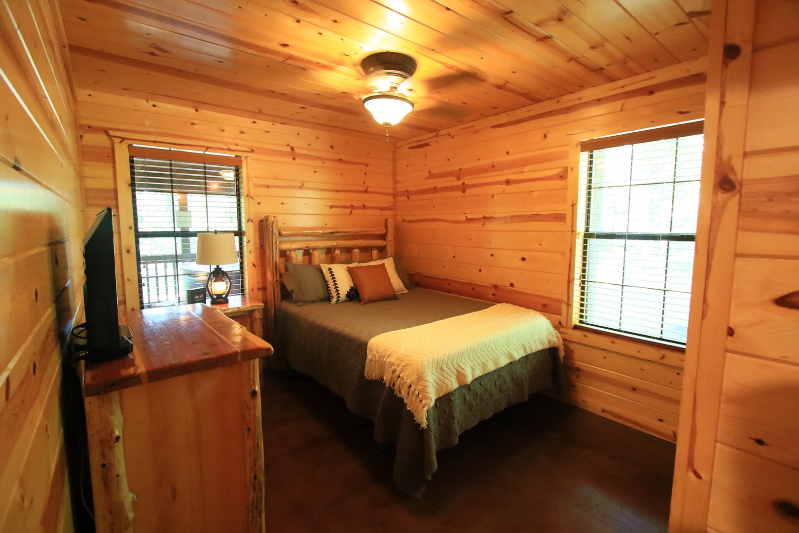 Located downstairs is a deluxe king bedroom and queen bedroom with cedar log beds and 1 full bath with a tub/shower combo as well as a washer and dryer. Both bedrooms are equipped with flat-screen Smart TVs and DVD players.
