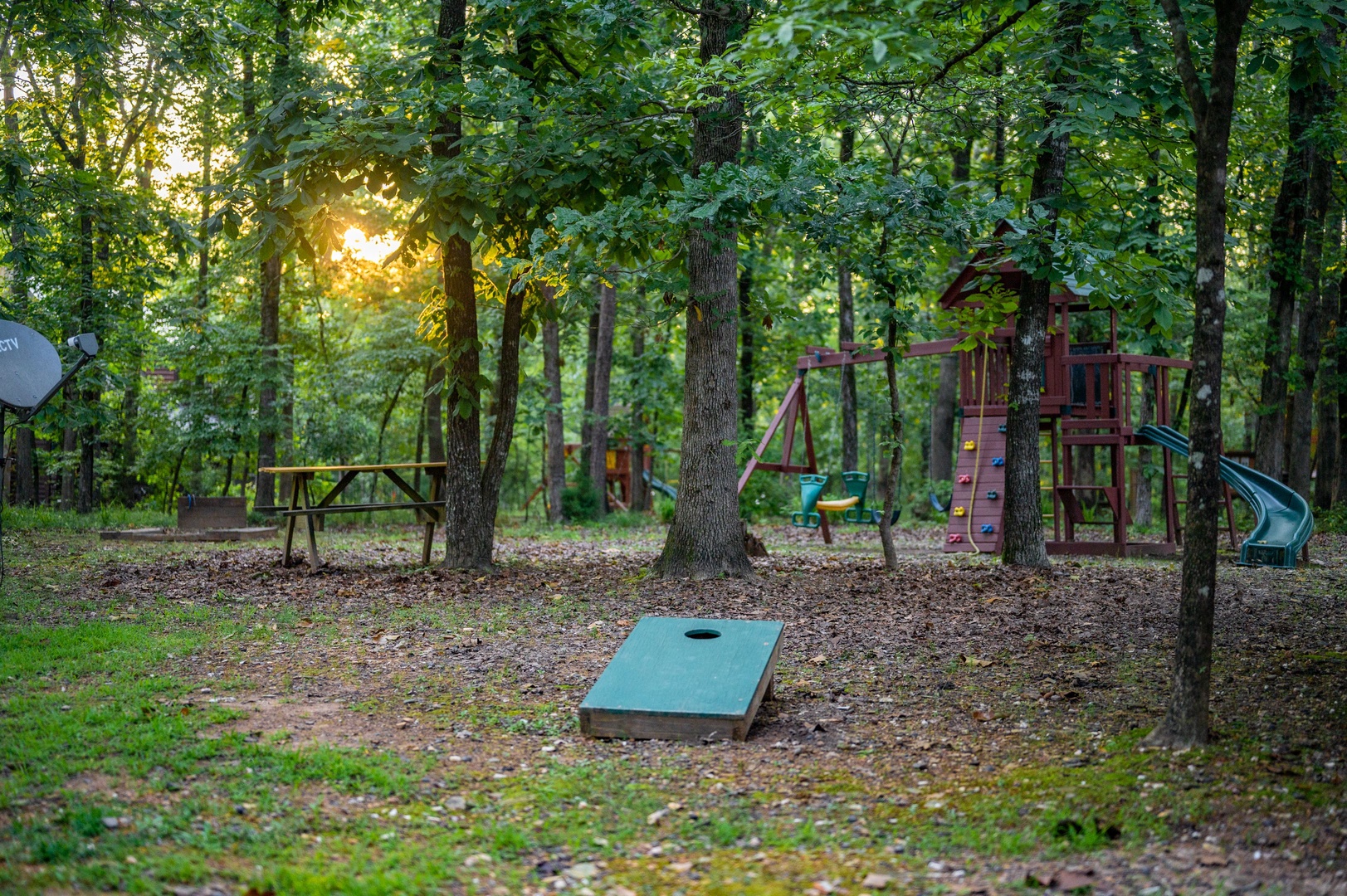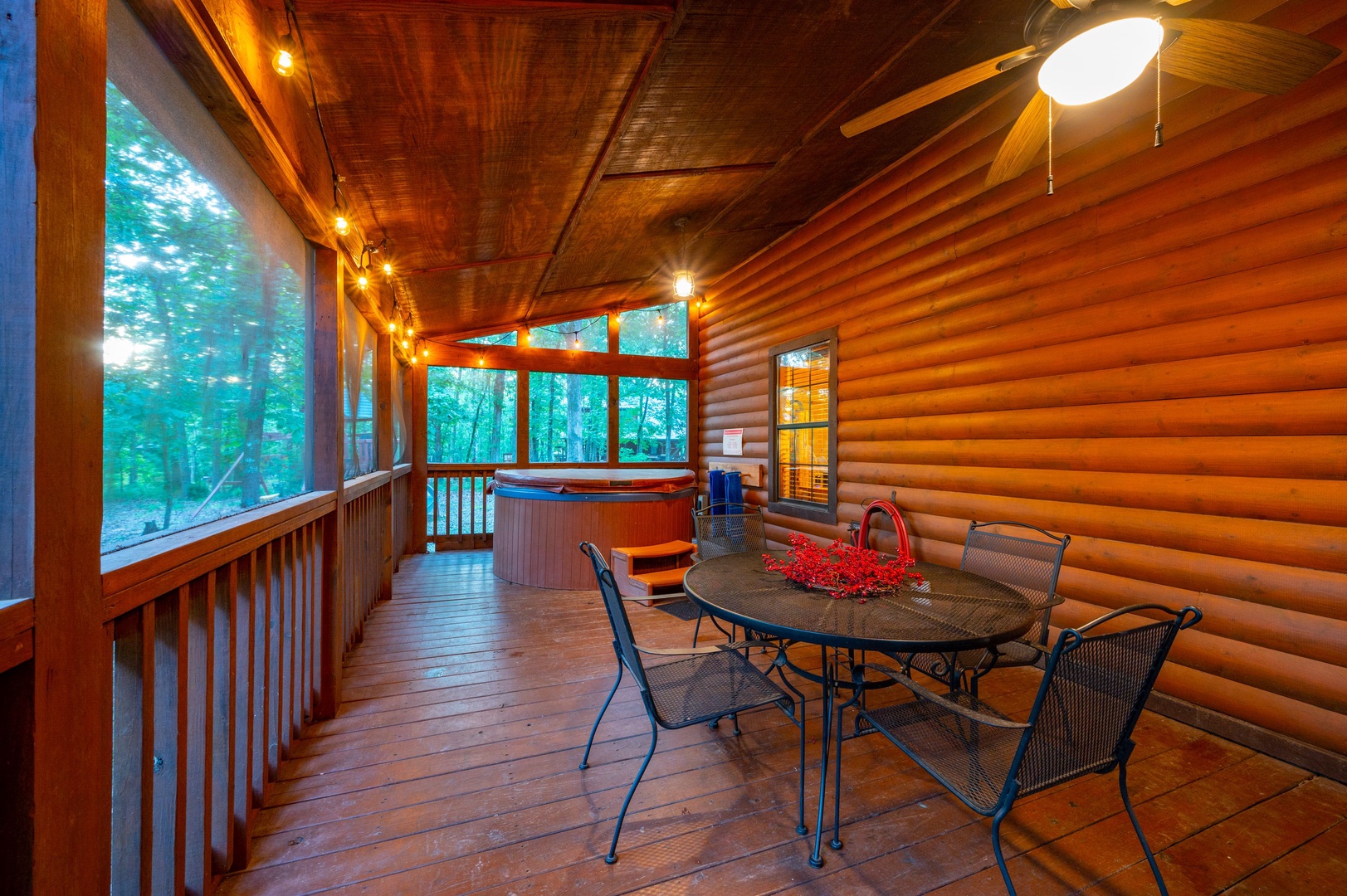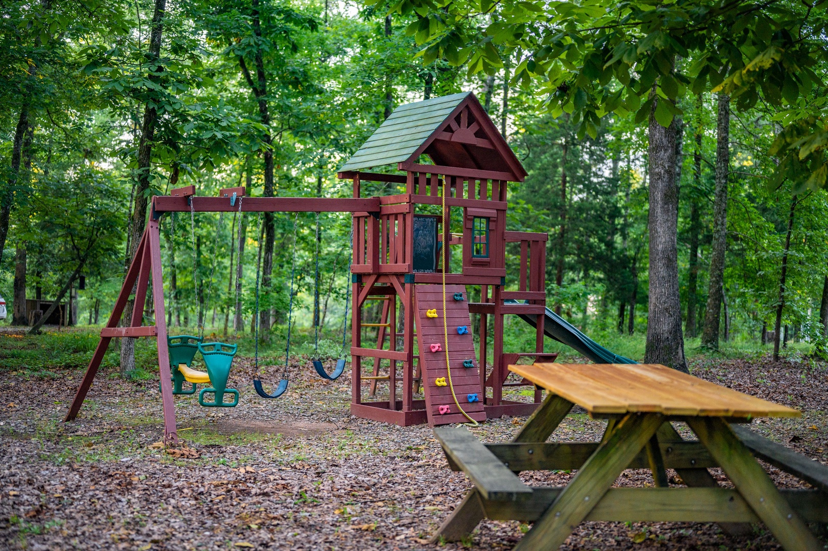 Outdoors you’ll find porches and decks on three sides of On a Break. The front and back decks are covered with the side deck being open. The front deck includes a bench and two rocking chairs, and the back porch has a fully screened-in area to escape insects with a patio table and chairs. Also on the back deck is a 5-to-6-person hot tub perfect for catching a glance at the deer that call On a Break home. There’s plenty of entertainment outside for kids of all ages with the playset and swing. For those young at heart, you’ll stay busy with the metal fire ring with swing-out grill, horseshoes, ladder golf, washer pitch, or Corn Hole toss.