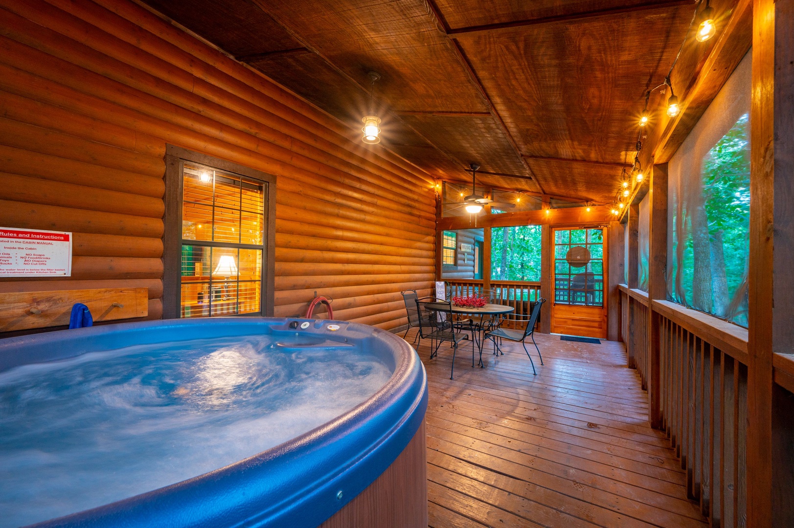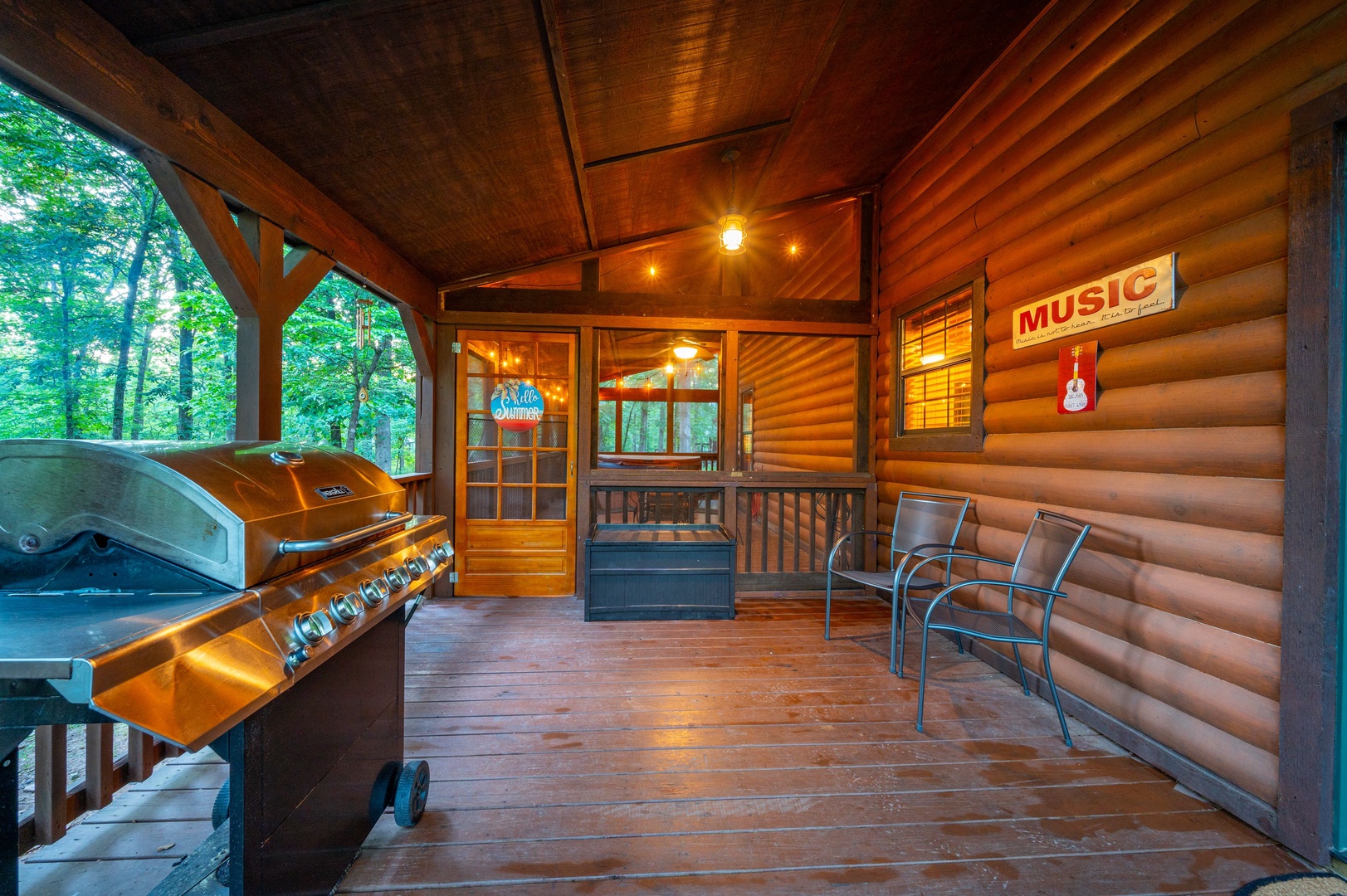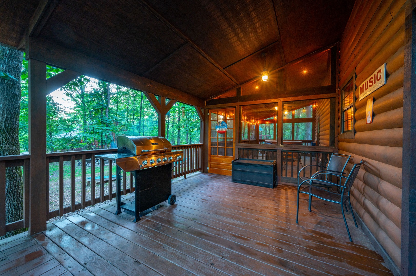 Outdoors you’ll find porches and decks on three sides of On a Break. The front and back decks are covered with the side deck being open. The front deck includes a bench and two rocking chairs, and the back porch has a fully screened-in area to escape insects with a patio table and chairs. Also on the back deck is a 5-to-6-person hot tub perfect for catching a glance at the deer that call On a Break home. There’s plenty of entertainment outside for kids of all ages with the playset and swing. For those young at heart, you’ll stay busy with the metal fire ring with swing-out grill, horseshoes, ladder golf, washer pitch, or Corn Hole toss.