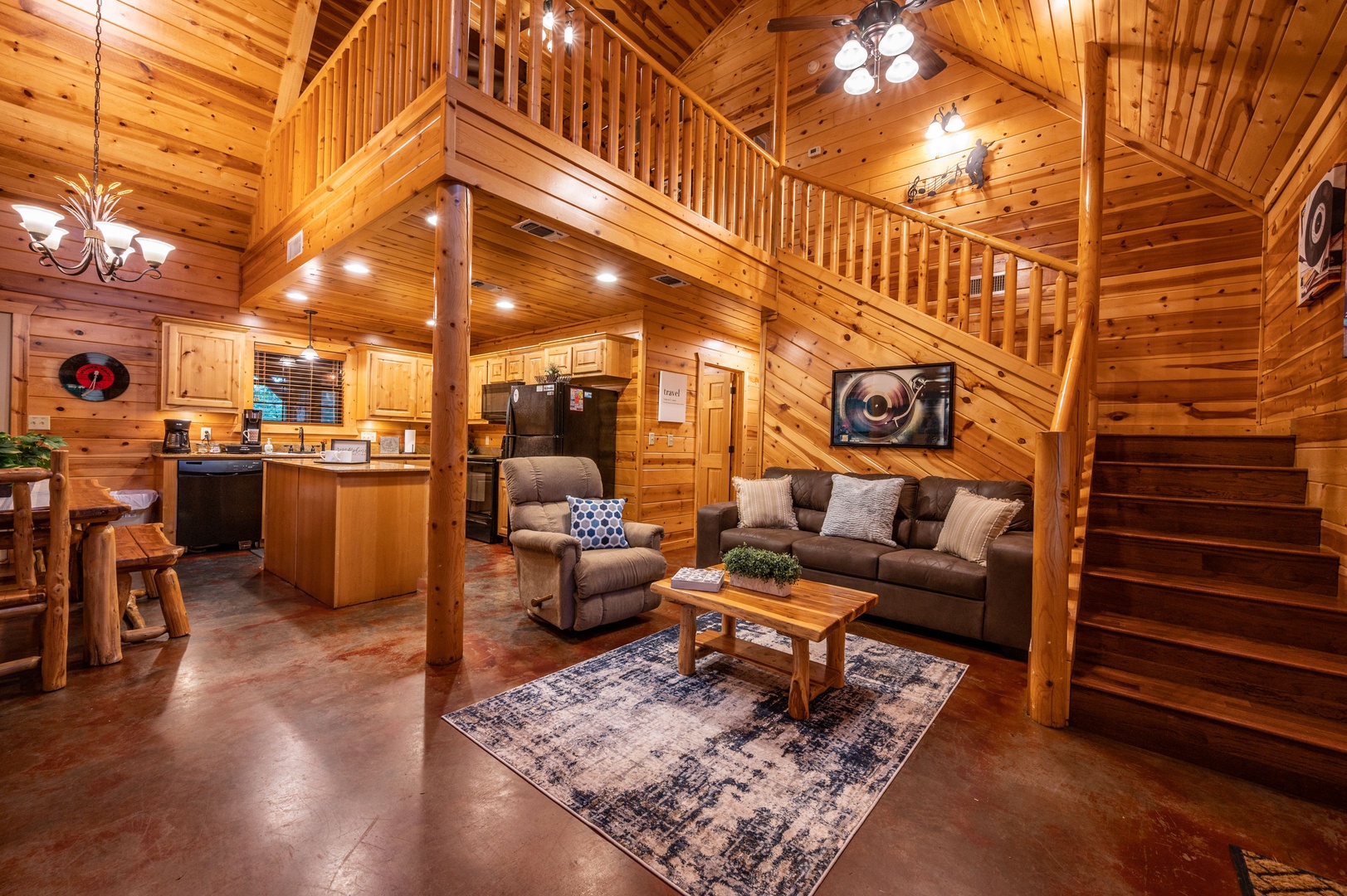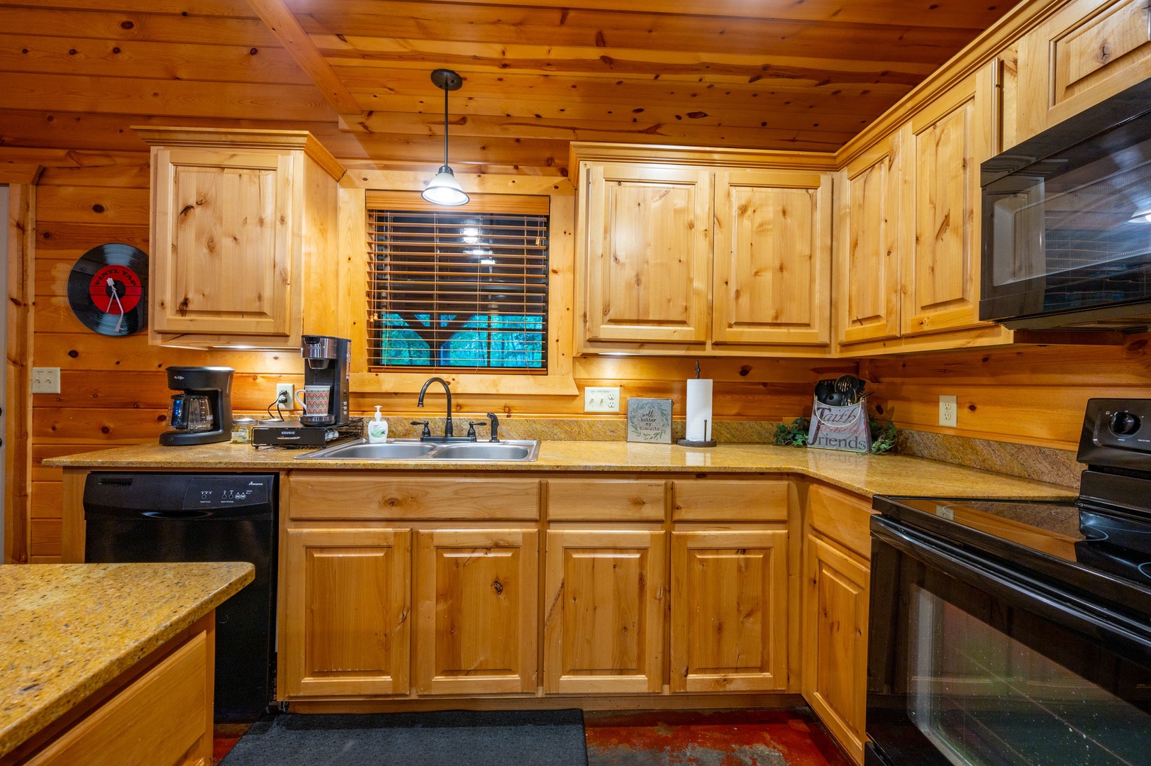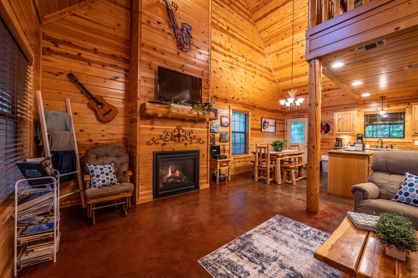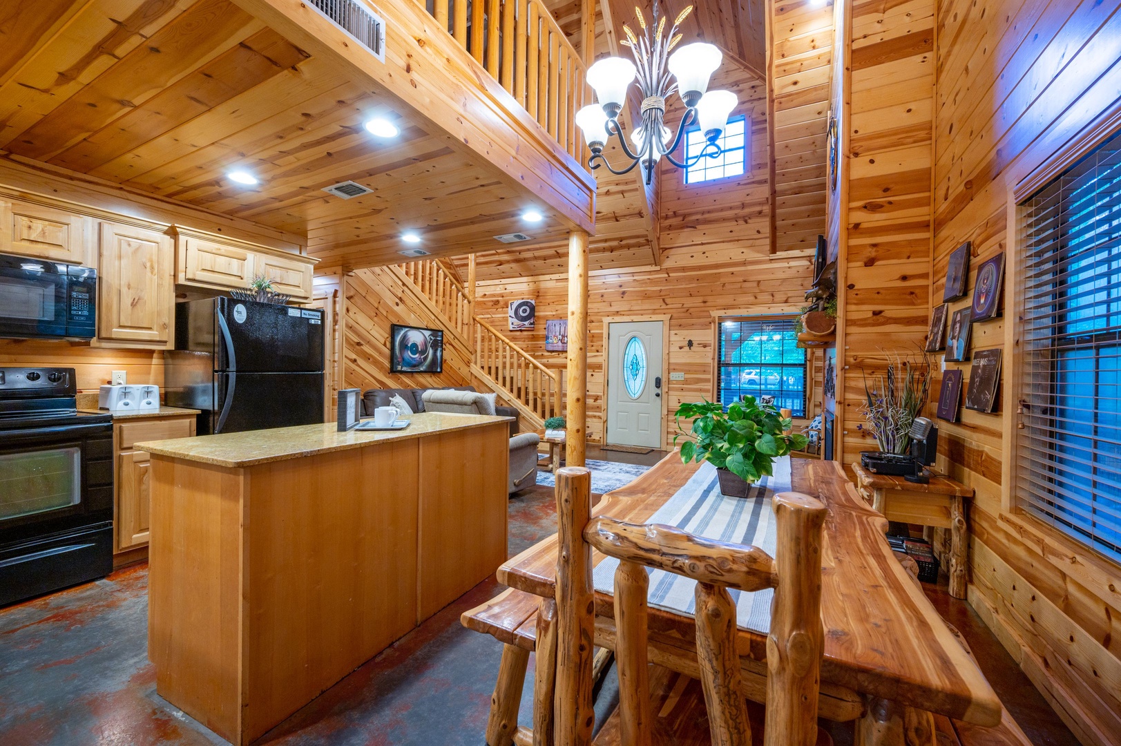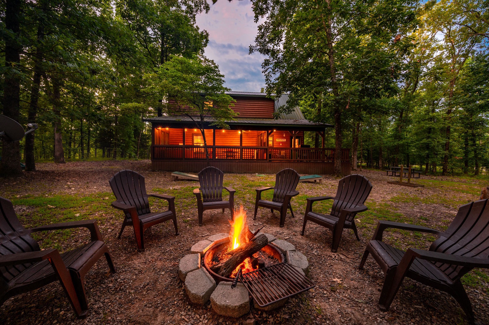 Guests are greeted by a large wrap-around porch that leads into the open concept cabin with direct access between the fully equipped kitchen and spacious living room. The kitchen comes with everything from cooking utensils to a Keurig and offers a large kitchen table for dining. There’s a gas grill on the back patio perfect for grilling your favorite feasts while enjoying the tree-swept landscape. Afterwards, enjoy s’mores by the outdoor fire pit, a soak in the hot tub, or relax by the ultra-convenient gas fireplace indoors.
