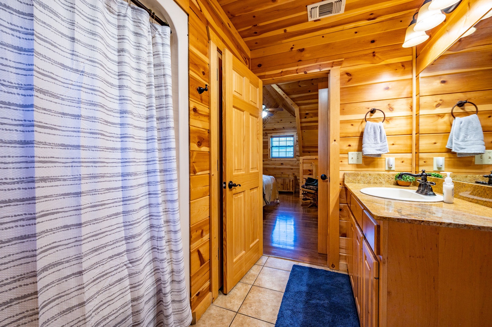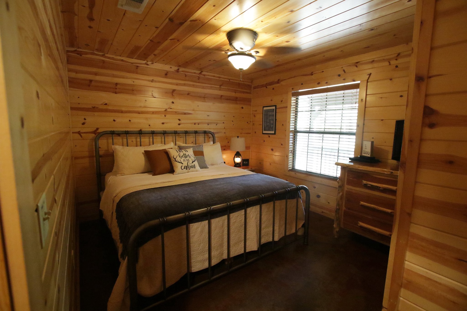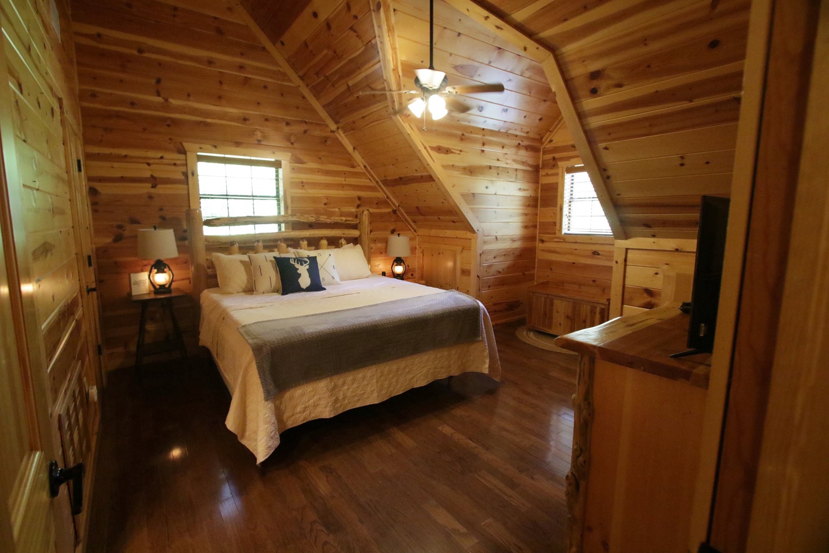 The upstairs master bedroom offers plenty of privacy from the second floor with a cedar log king bed and a private full bath with tub/shower combo. The upstairs master bedroom also features a glider chair for reading, a closet with generous hanging storage for clothes, and a chest of drawers along with a Smart TV and DVD player.