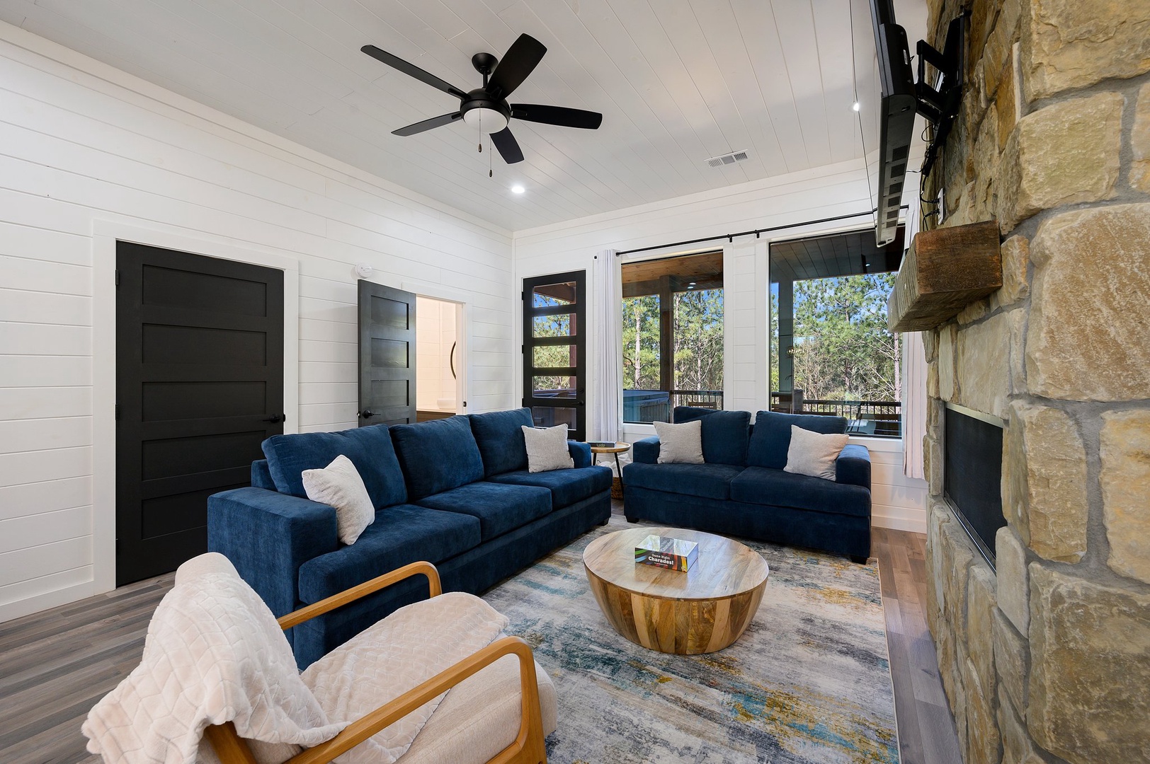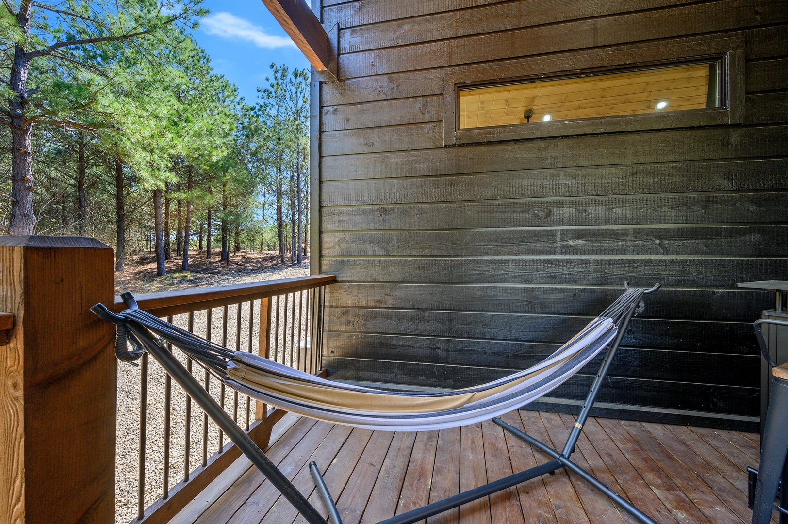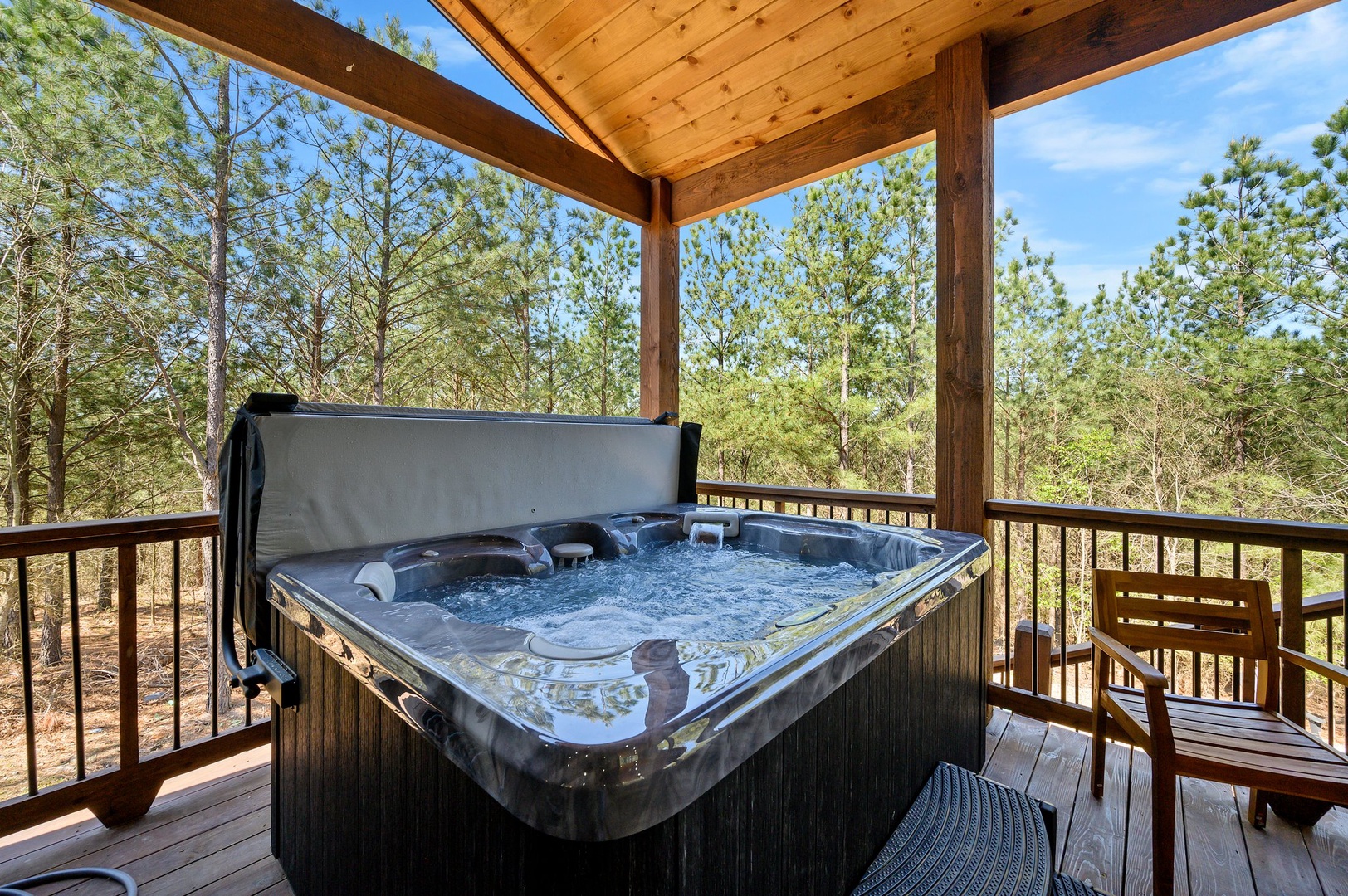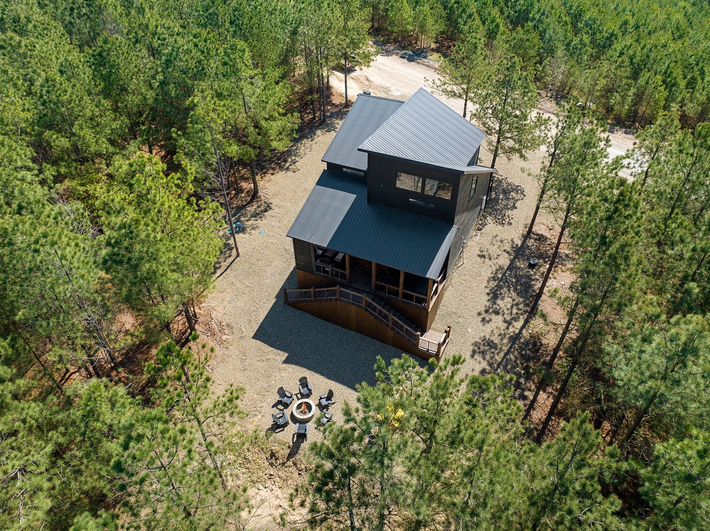 The large patio has another fireplace to keep the atmosphere warm and inviting for your open-air living. There is also a grill, outdoor bar, and dining area, to accommodate guests. For the more rustic experience, there is an open fire pit ring away from the deck where you can roast your marshmallows, build your S’mores, while enjoying the sunset as you continue to bond with your loved ones and with nature. You are a 5-minute drive from restaurants and bars such as Fish Tales Winery and Vineyard, Shady Oaks, and Buffalo Grill 8- minute drive to Hochatown
